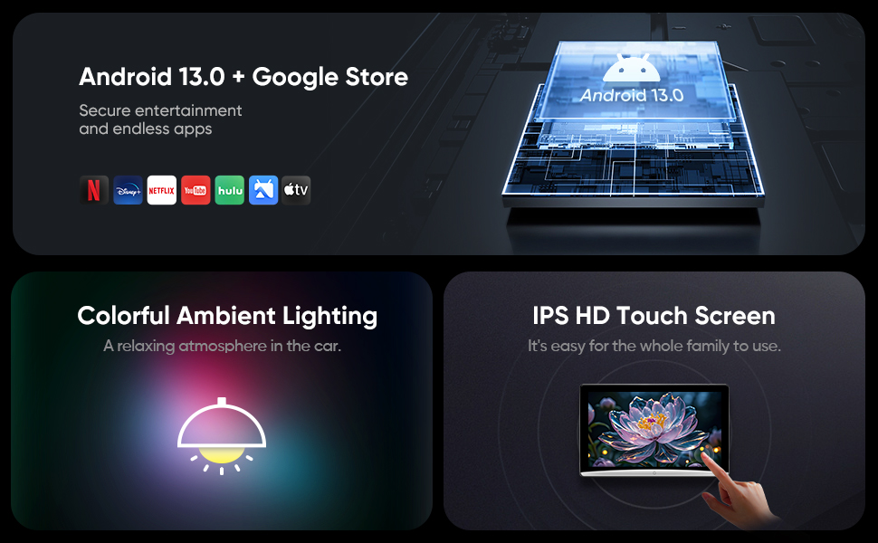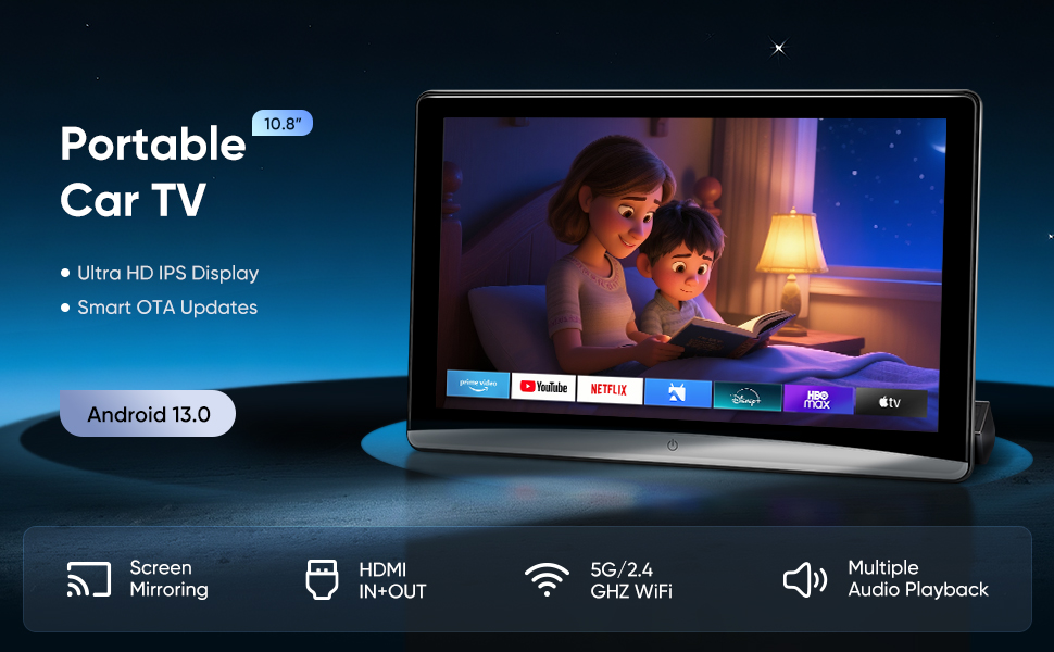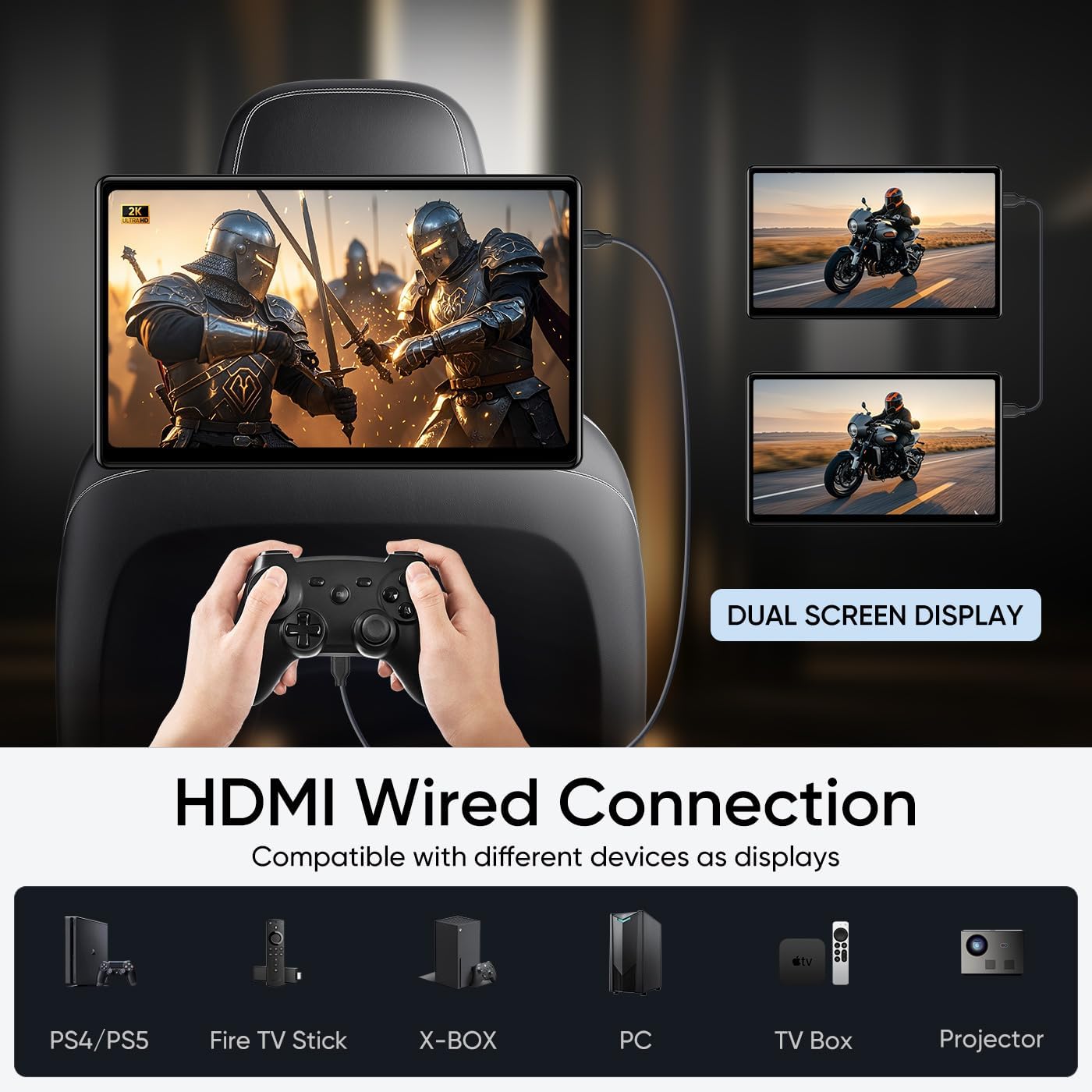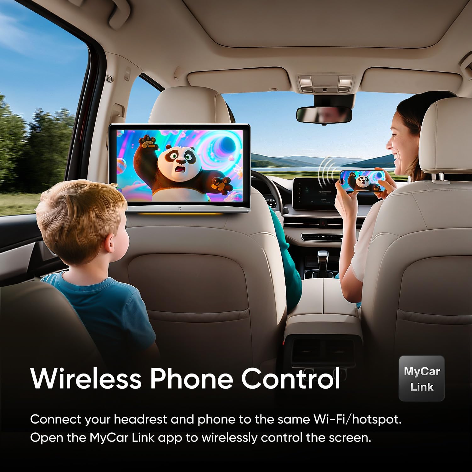 Upgrade Android 13 Car TV: Car tv for back seat comes with Android 13 system, support WiFi 5G/2.4GHz and connect to cell phone personal hotspot, bring you clearer and brighter image. You can watch your favorite movies and shows without missing any details. The headrest monitor allows your kids to enjoy watching movies on long drives, say goodbye to boredom, whining and crying