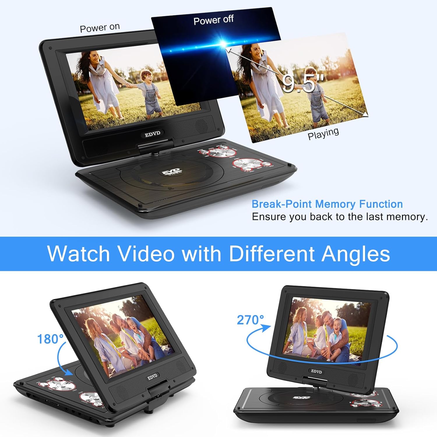 【Excellent visual experience】9.5-inch SQQBZZ portable DVD player has a 270° rotating and 180° flipping eye protection screen, the resolution can reach 800*480. The body is compact and easy to carry, it is very suitable to put on the car seat, giving you an excellent visual experience.