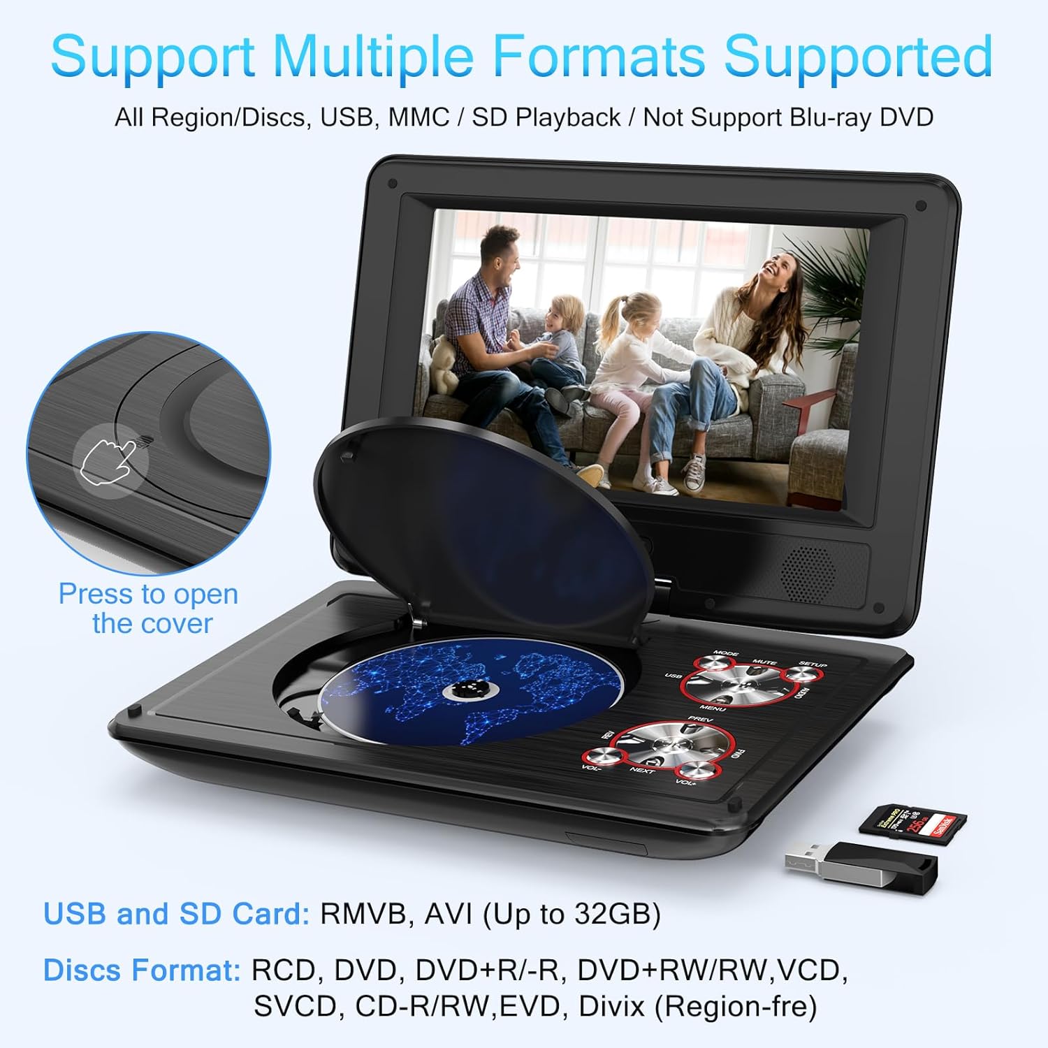 Perfect gift: A Perfect Choice As A Gift For Your Children or Parents On Halloween, Thanksgiving, ChristmasTravel:DVD players can bring joy to children on a trip; They can watch their favorite cartoons, which solves the problem of children getting bored during long drives.Study:Children can play some online teaching videos by inserting learning discs, U disks or SD cards. Learn foreign languages, mathematics, biology or any other subjects.Work:Open multi media file to watch work project/table or any other picture, video, audio to view jobs.