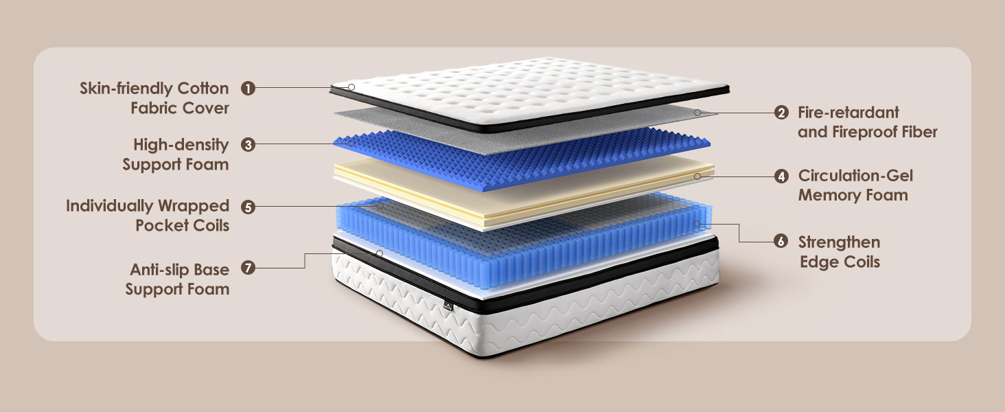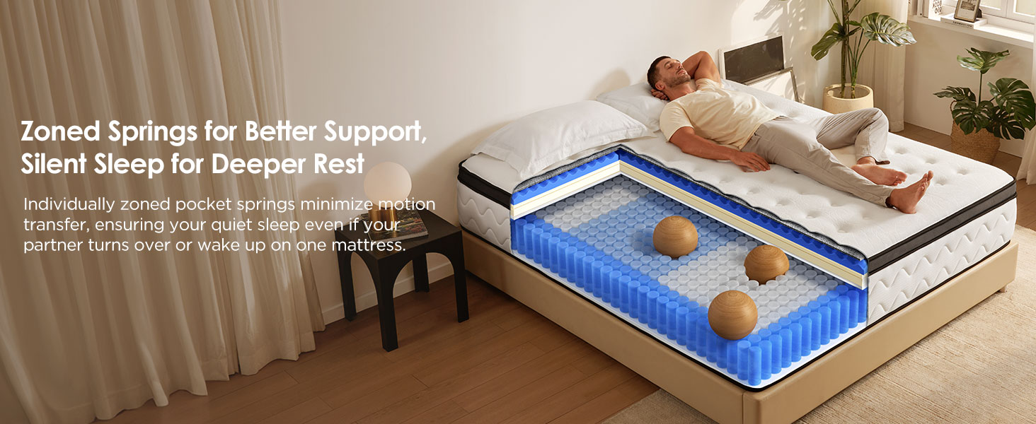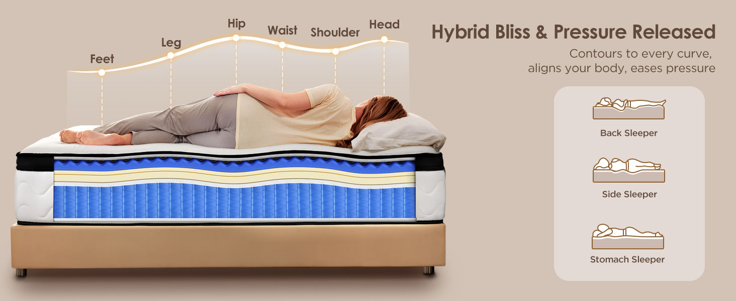 Targeted Support & Pressure Relief: This queen mattress ensures superior spinal alignment through its responsive high-density memory foam and individually wrapped pocket springs. It offers precise support to key areas, effectively alleviating pressure for back, side, and stomach sleepers