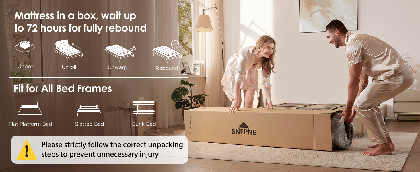 Proper Unpacking Steps Guide: ①Remove the mattress from the packaging box. ②Do not use sharp objects, locate the opening of the outer plastic film and tear it open by hand. ③Unroll and lay the mattress flat on the bed frame or floor. ④Carefully cut open the compressed plastic wrapping the mattress with the included opener. ⑤The mattress will expand when it contact with air, keep the mattress still for 72 hours to achieve optimal expand effect. ⚠ Please strictly follow the proper unpacking steps to prevent the mattress from rapidly expanding upon air intake, which may cause violent impact and result in unnecessary injury