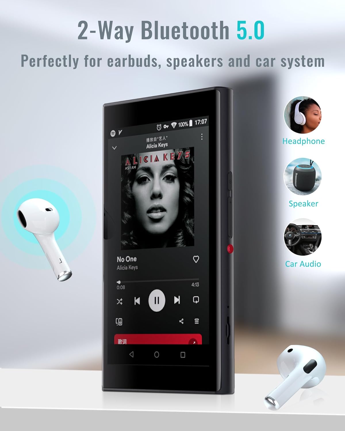 【Dual-Band WiFi & 2-Way Bluetooth】This streaming music player features Dual-band Wi-Fi (5GHz and 2.4GHz). It offers stable and fast connection for streaming music, videos, audiobooks, and e-books; With 2-Way Bluetooth 5.0, it allows easy pairing with headphones, speakers, or car audio systems, and also supports file transfers between devices for easy sharing.