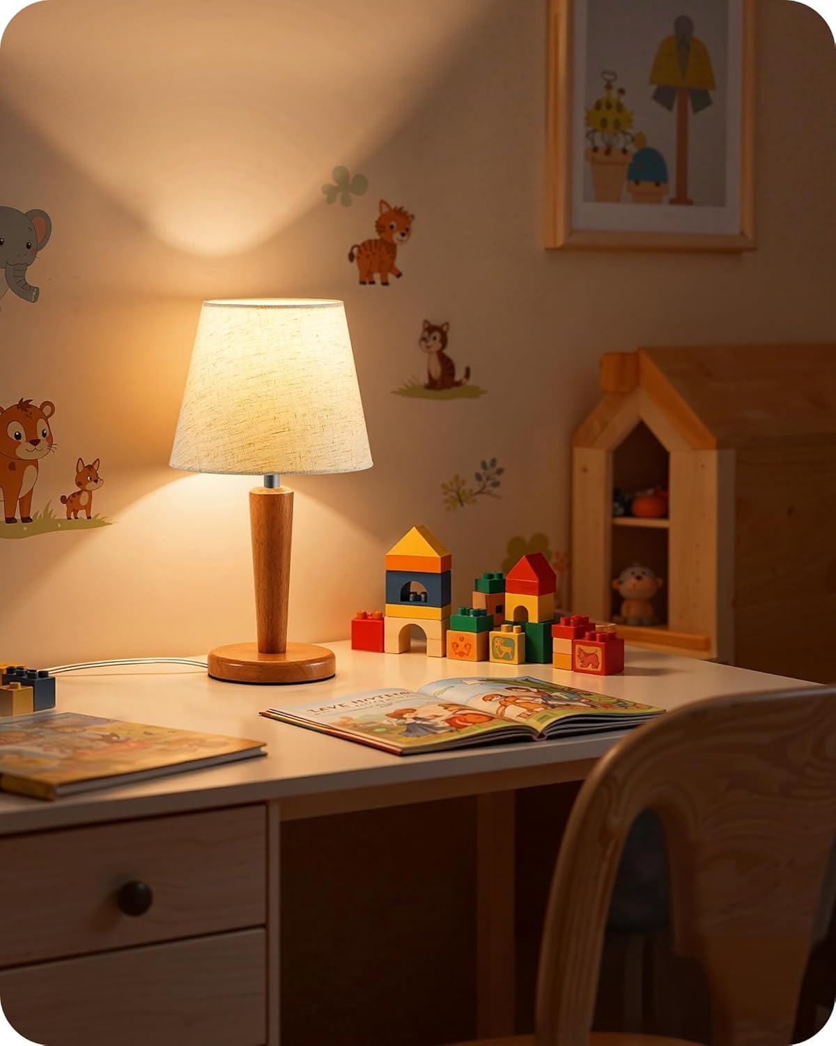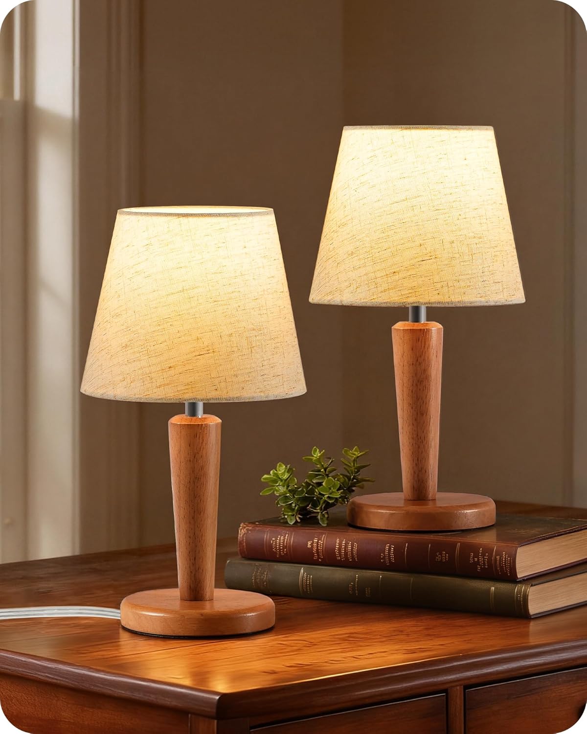 12”Wood Bedside Table Lamps Set of 2, Small Desk Lamps for Small Places, 3 Color Temperatures with Memory,Beige Linen Shade & E26 Bulbs, for Bedroom Living Room Office LE13TLP205