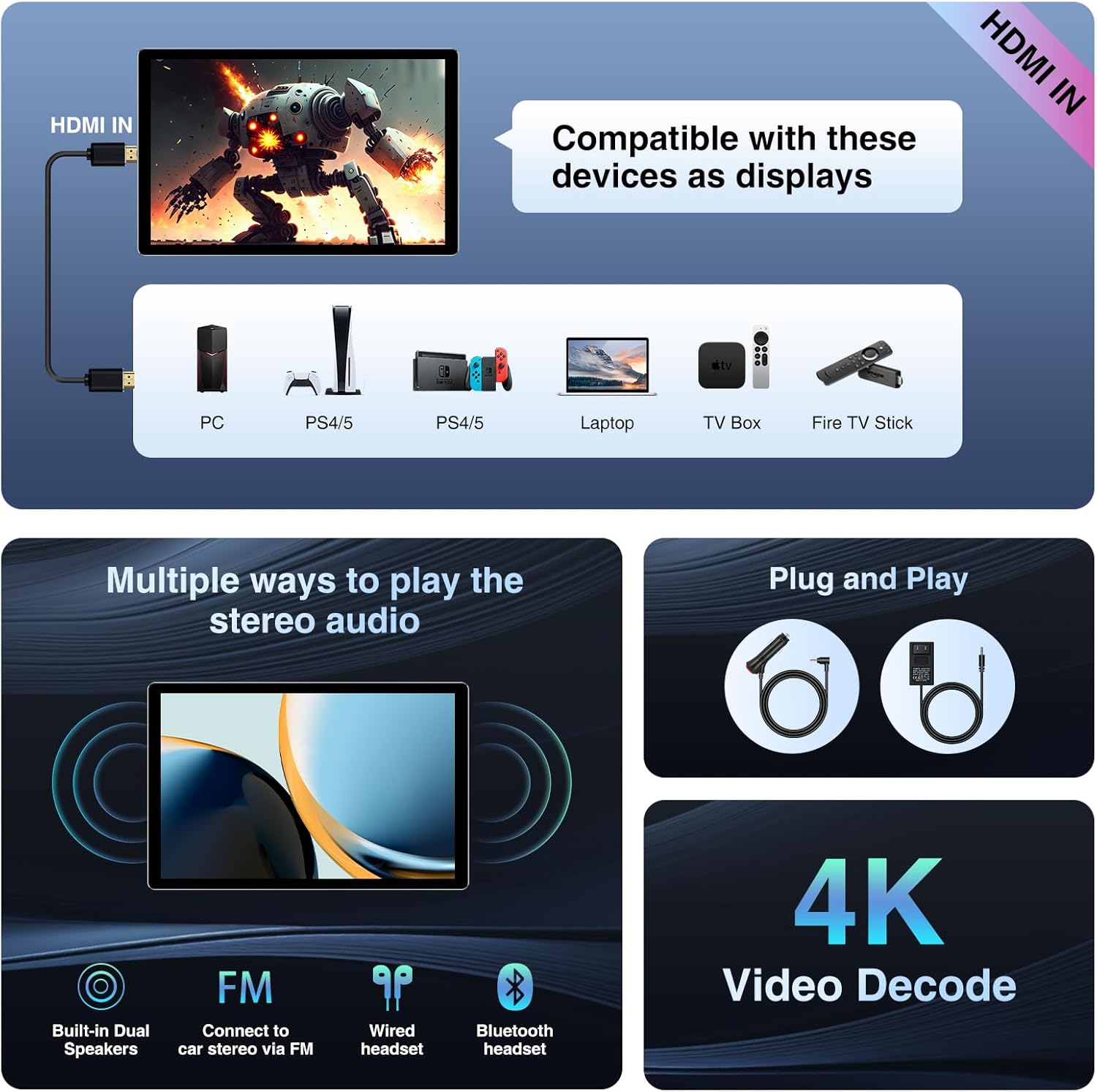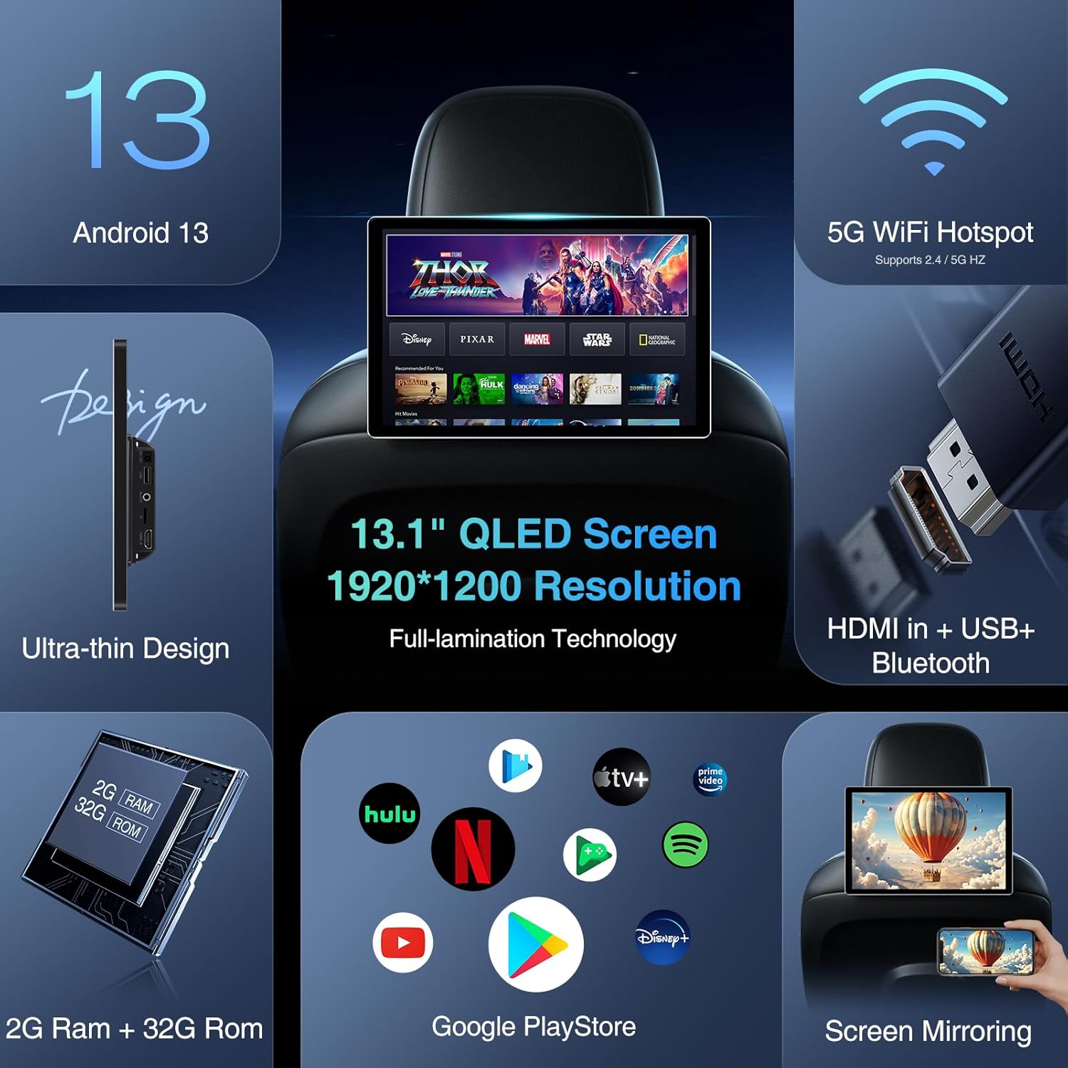 13.1-inch Android 13 Multi-Functional Car TV Headrest Monitor for Back Seat, Full High Definition QLED Touch Screen Video Player, Support WiFi/Bluetooth/Mobile Mirror Link/HDMI/USB/RCA