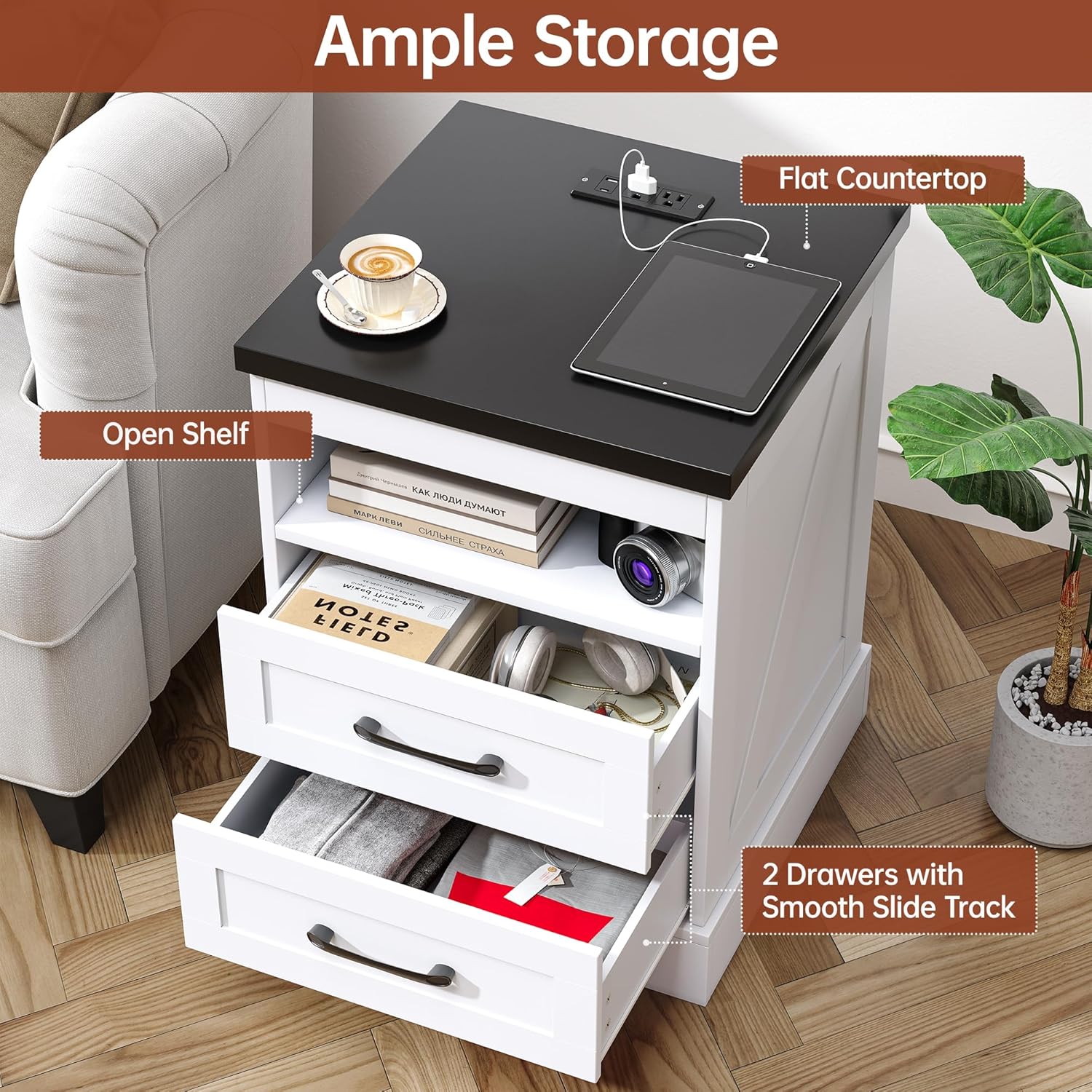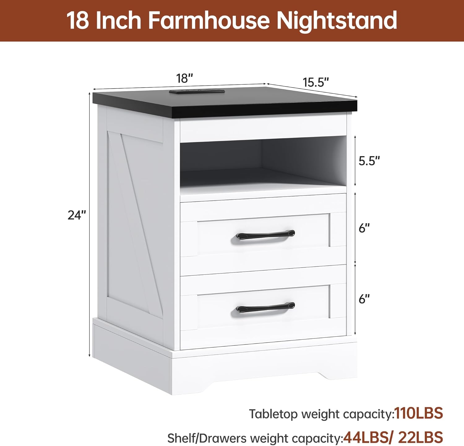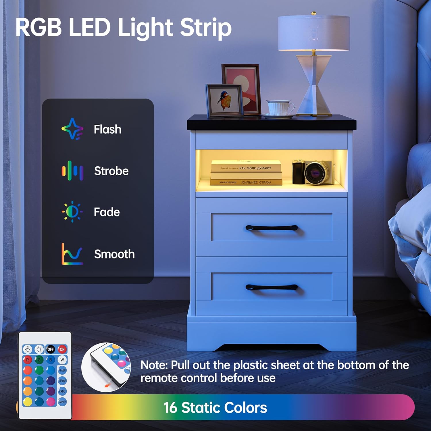 18” Nightstand with LED Lights, White Farmhouse Bedside Table with 2 Drawers and Open Storage Shelf, Built-in Power Outlets & USB Ports, End Table for Bedroom, Living Rooms, Home Offices,White