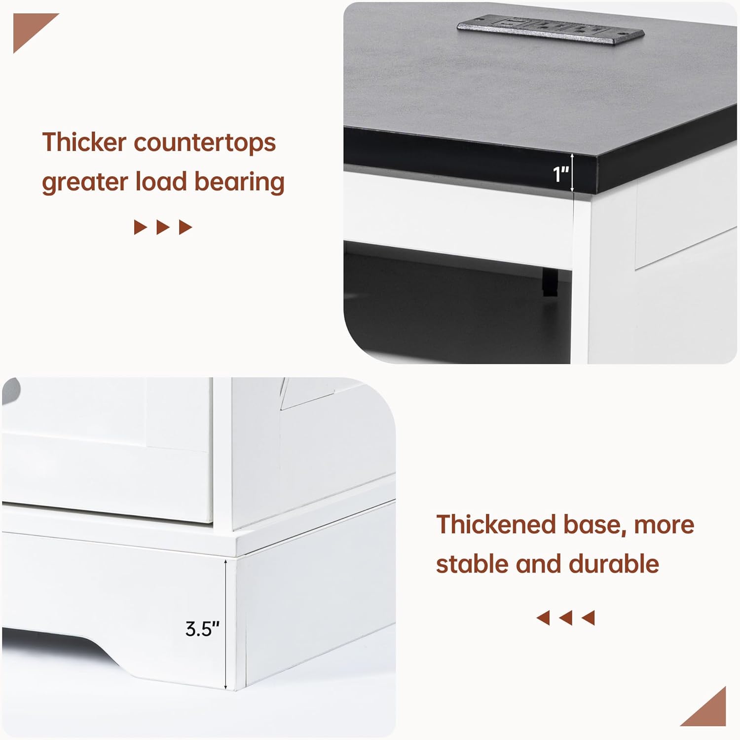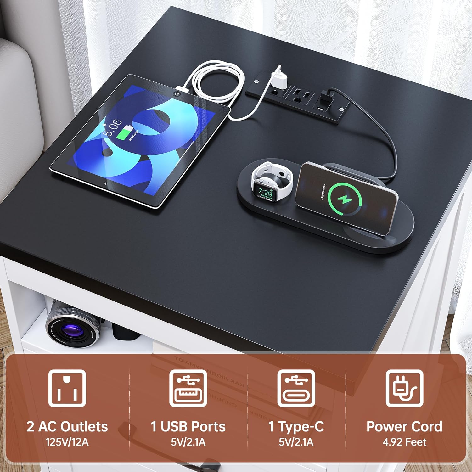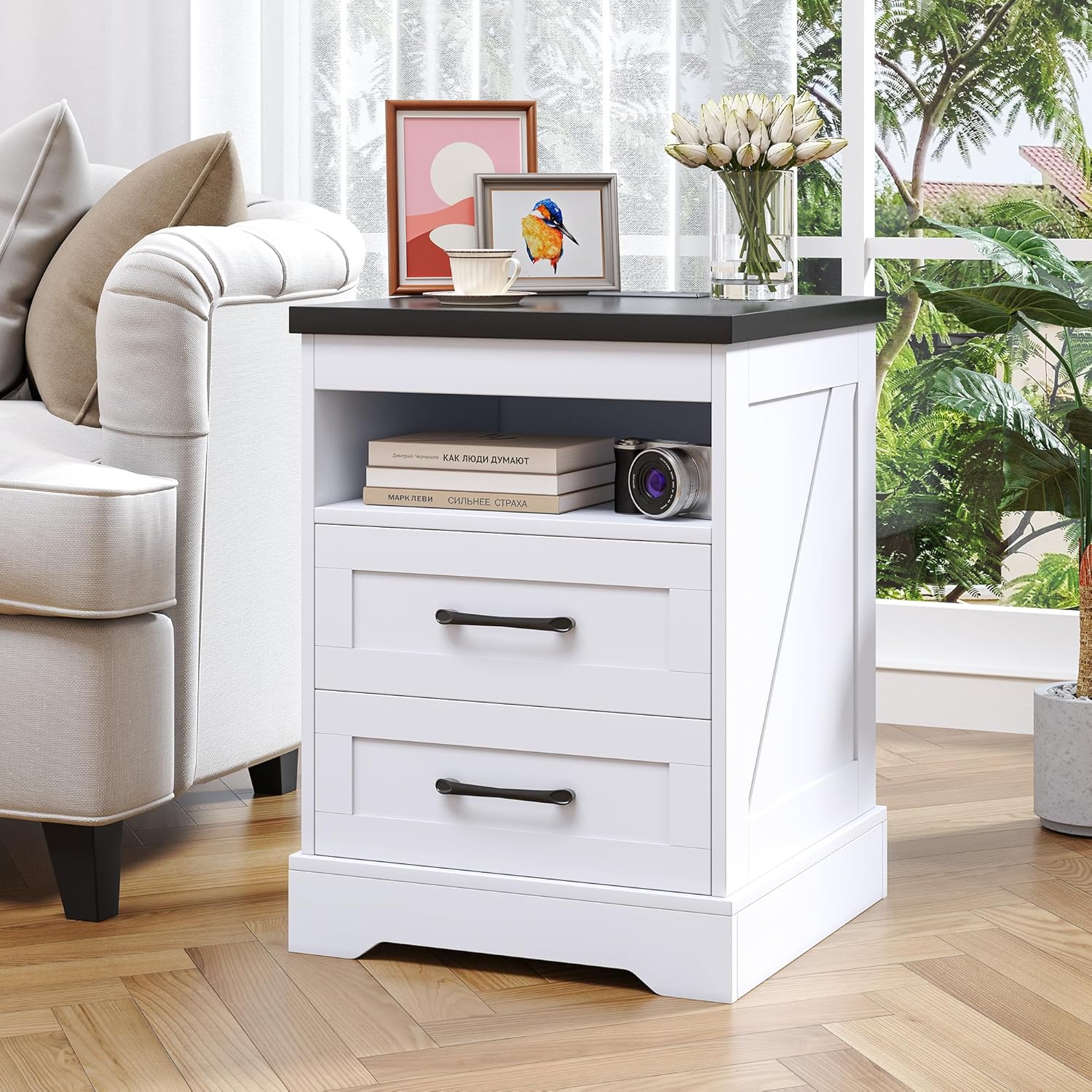 18” Nightstand with LED Lights, White Farmhouse Bedside Table with 2 Drawers and Open Storage Shelf, Built-in Power Outlets & USB Ports, End Table for Bedroom, Living Rooms, Home Offices,White