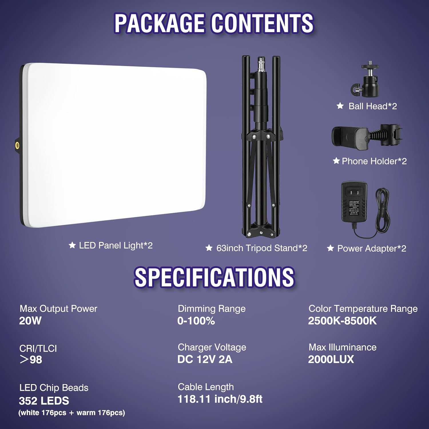 Package & Customer Support: Our package includes: 2 x Studio Light Panels with cables, 2 x Adjustable Tripod Stands, 2 x Phone Mount Clip, 2 x Ball Heads, 2 x AC/DC Adapters, 1 x User Manual. If you encounter any issues during use or notice any defects, our dedicated support team is always ready to assist