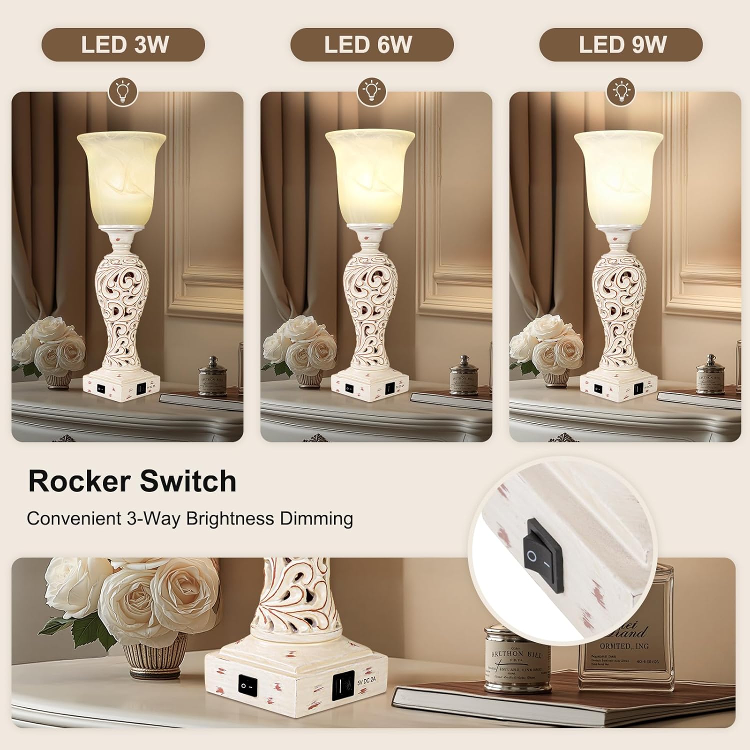 The farmhouse desk lamp uses a rocker switch, and the 3-step dimmable brightness: 3W, 6W and 9W. You can choose the appropriate brightness according to your needs.