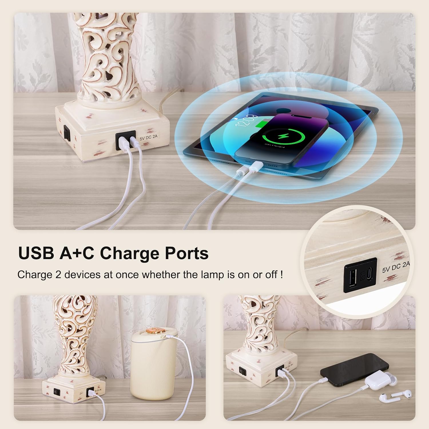 USB A+C Charging Ports: This nightstand lamp has built-in dual USB ports, allowing you to charge 2 devices at the same time, even when the lamp is off. It can easily charge your phone, iPad, Kindle, etc., bringing convenience to you and your family.