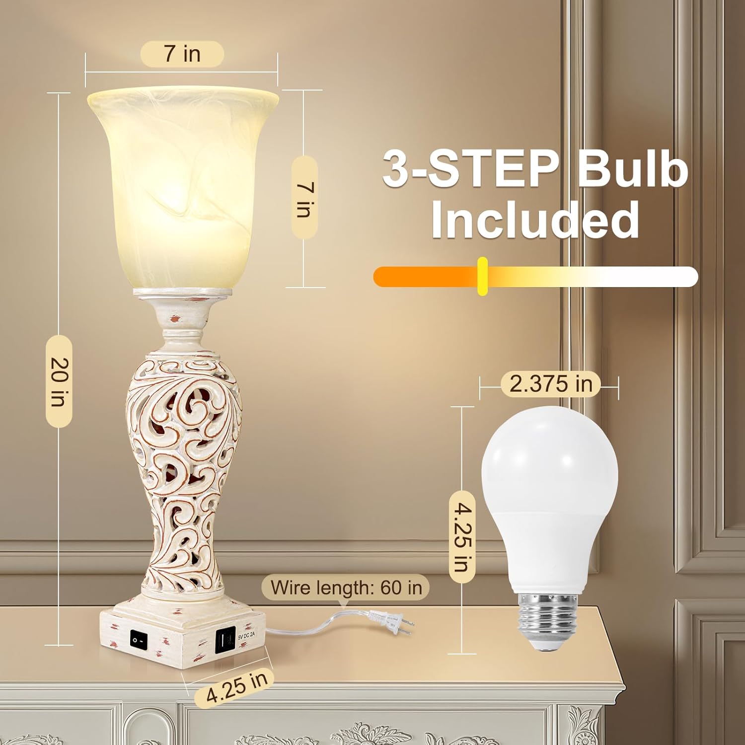 The white alabaster glass lampshade makes the retro table lamp light softer. And it has dual USB charging ports, which is convenient for charging your two electronic devices at the same time.