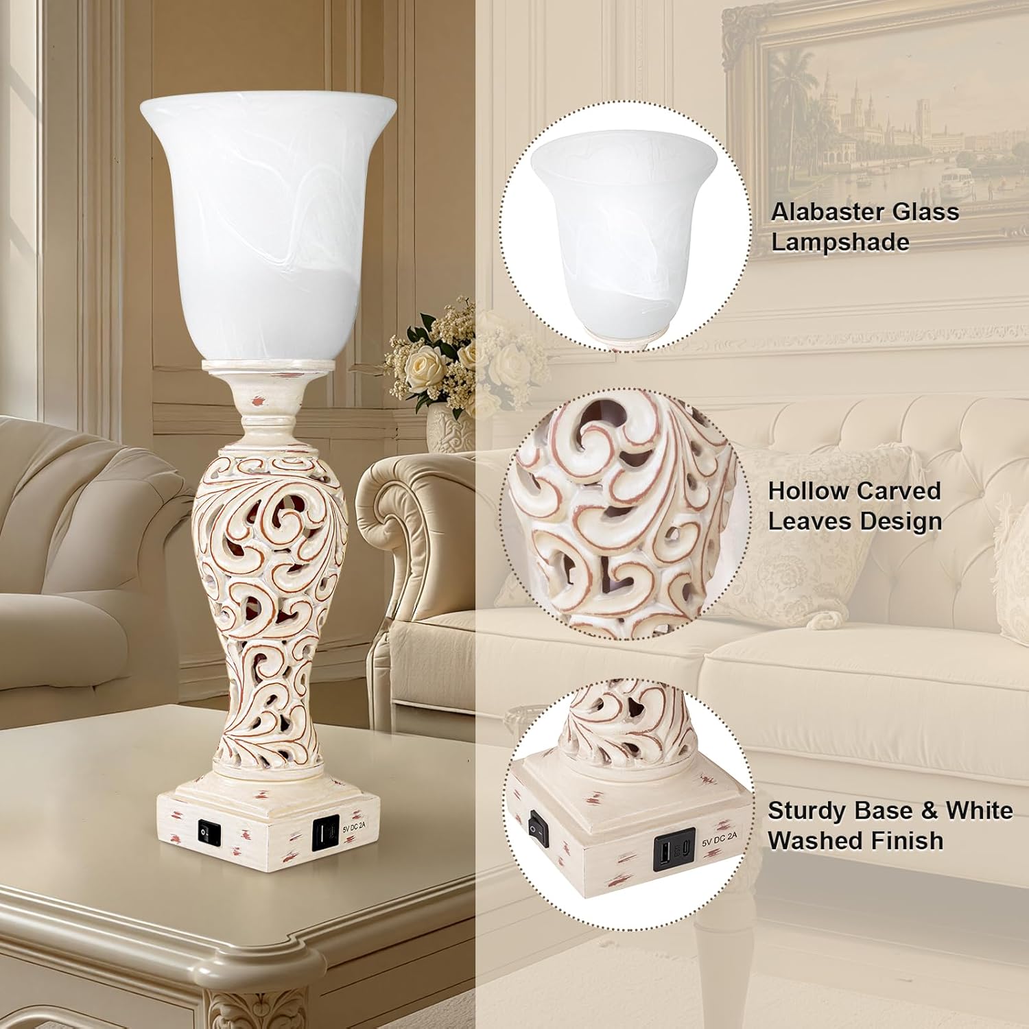 Unique Design: Designed with beautifully hollow carved leaves, this uplight table lamp creates a cozy ambiance in any room. The washed white resin finish adds a vintage touch, making it suitable for your living room, bedroom, office, study room, hallway.