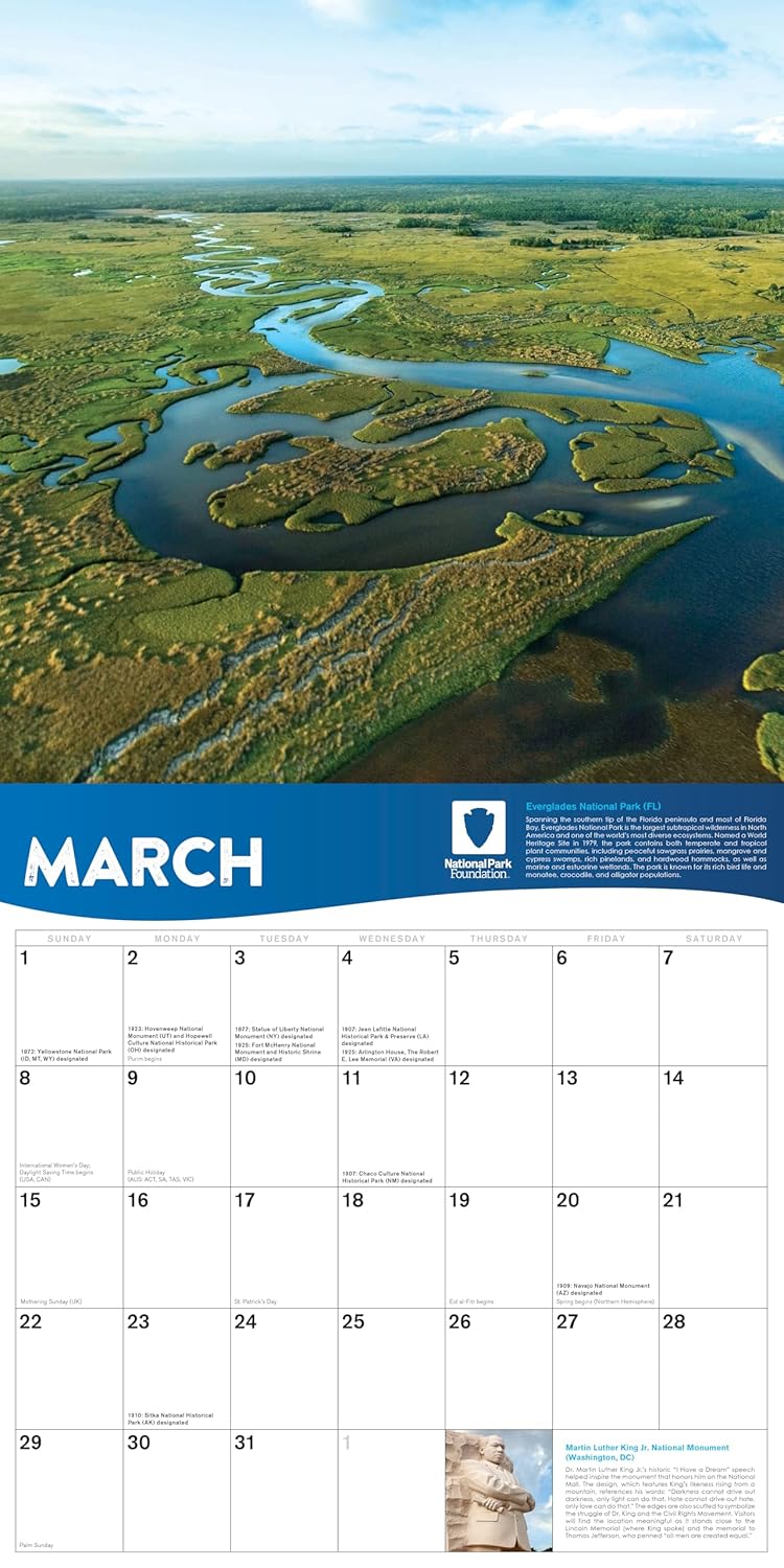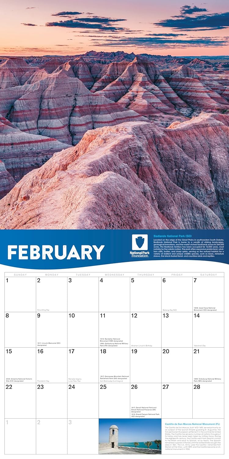 12-month nature calendar (January – December 2026) with 12″ x 12″ trim size and a sturdy hole for easy hanging in your home, kitchen, or officeStriking, full-color historic and nature photography printed on high-quality, glossy paper stock with 25 total featured parksBackground and historical information about each site to inform your travel inspirationEnvironmentally responsible, FSC certified paperAmple writing space each day to stay organized and jot down important reminders, tasks, appointments, and goalsHolidays and observances, plus significant park anniversariesQR-code to learn more about all of parks protected by the National Park Foundation2027 calendar year at a glance