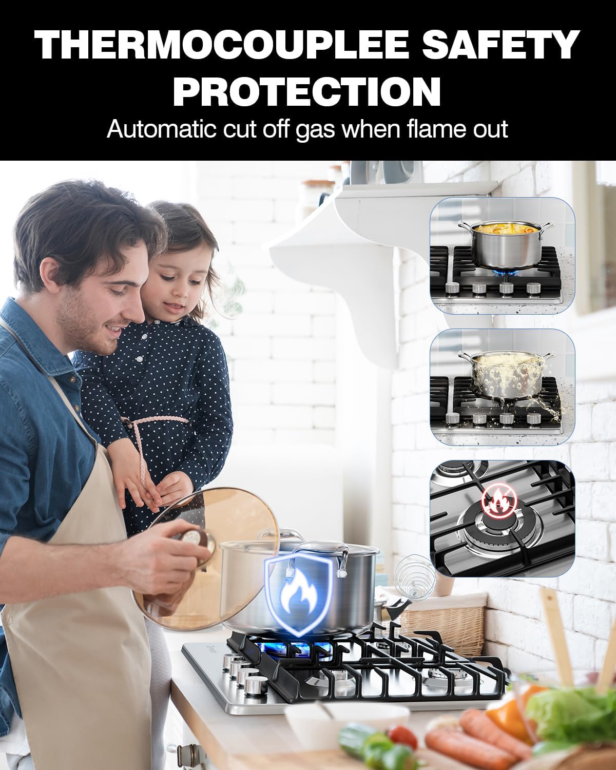 【THOUGHTFUL GAS HUB】Features melt-proof and anti-scalding knob controls with a child safety lock. TOPWISH gas stove top knob must be pressed and turned simultaneously to ignite, ensuring safety. The heavy-duty cast iron grates are stable and reliable, suitable for various cookware without deformation or slipping.