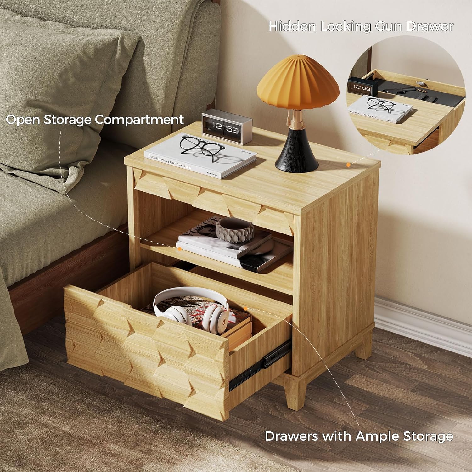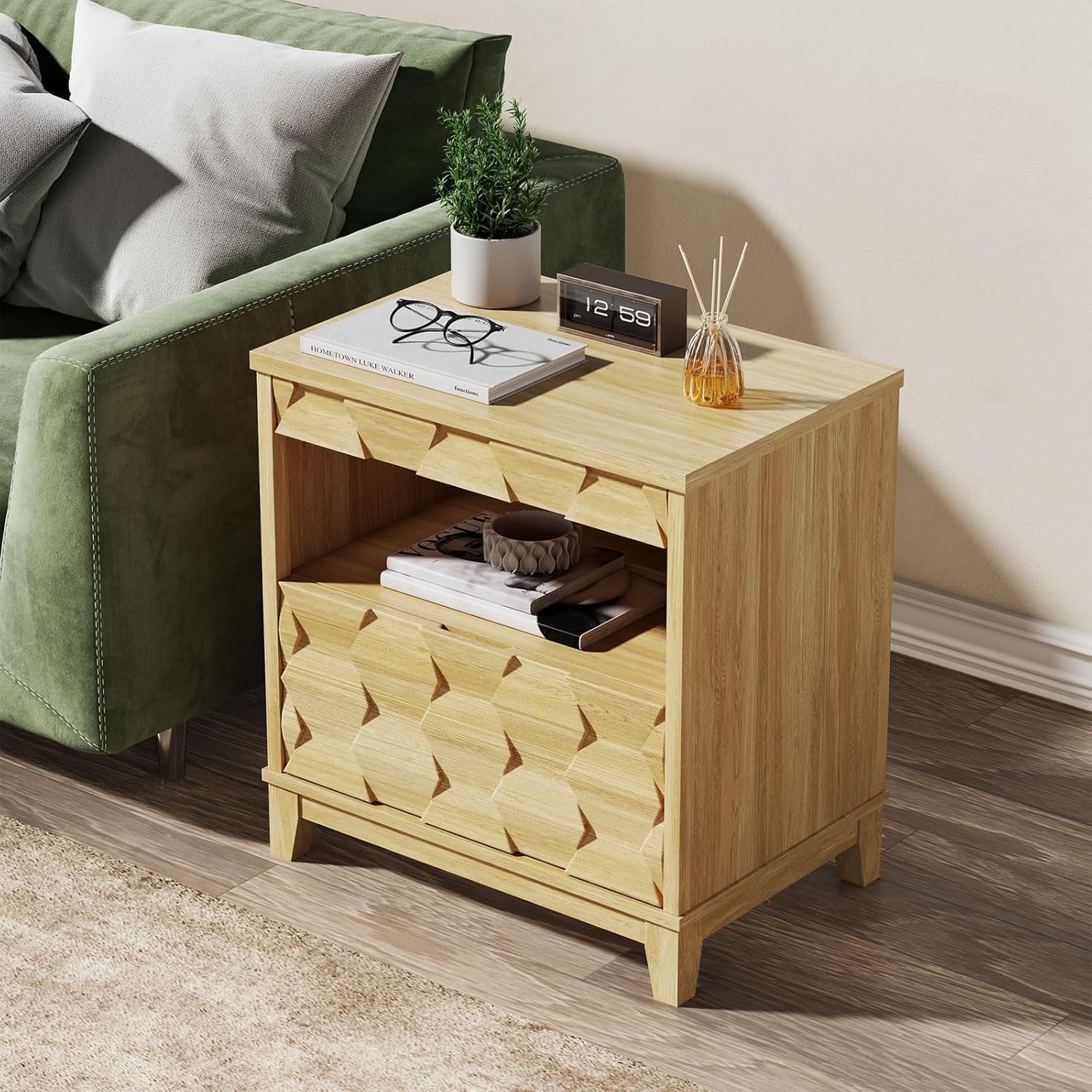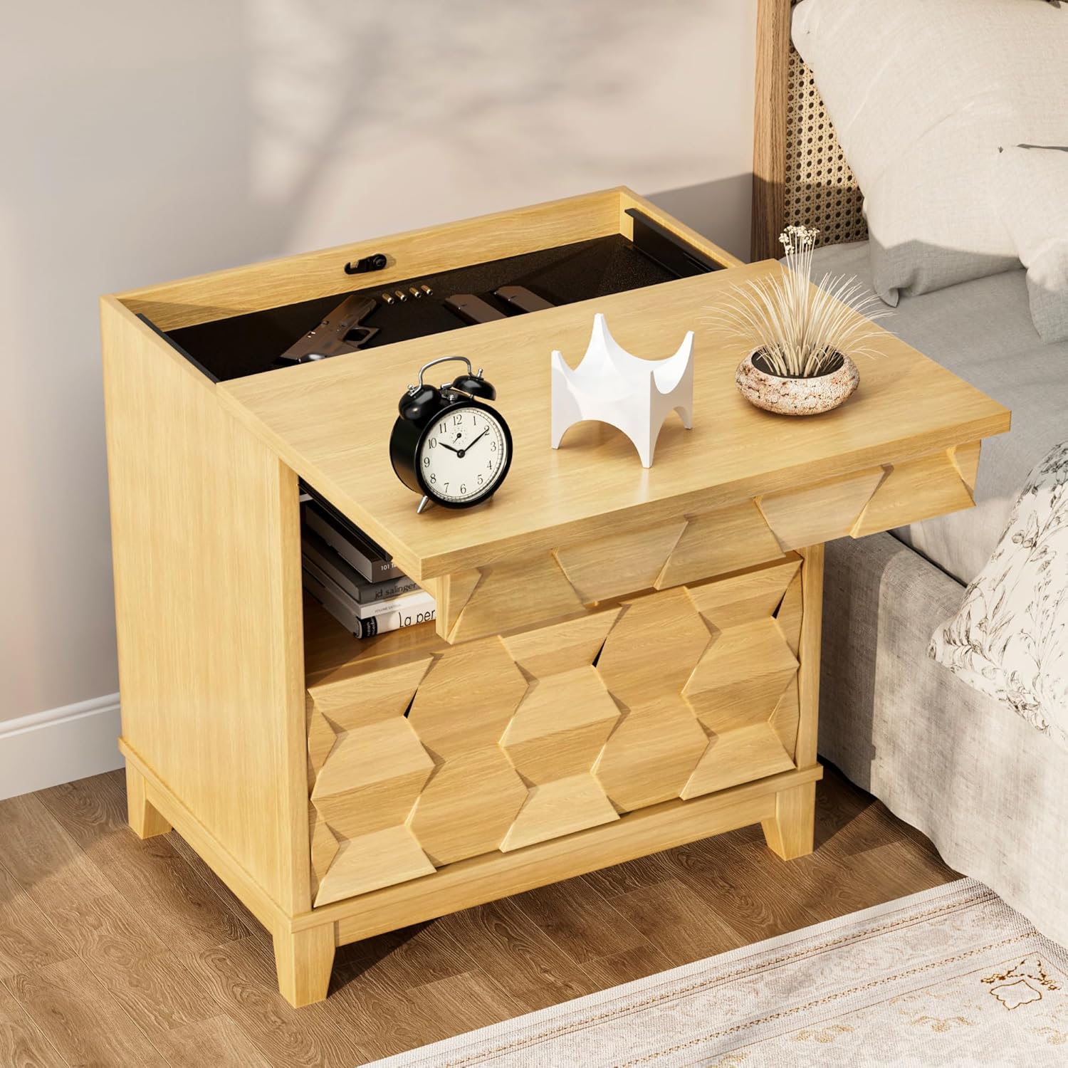 24″ Wide Night Stand with Gun Drawer, Modern Fluted Bedside Table with Unique 3-Dimensional Craft, Wood Sofa Couch End Side Table for Bedroom Office, Natural