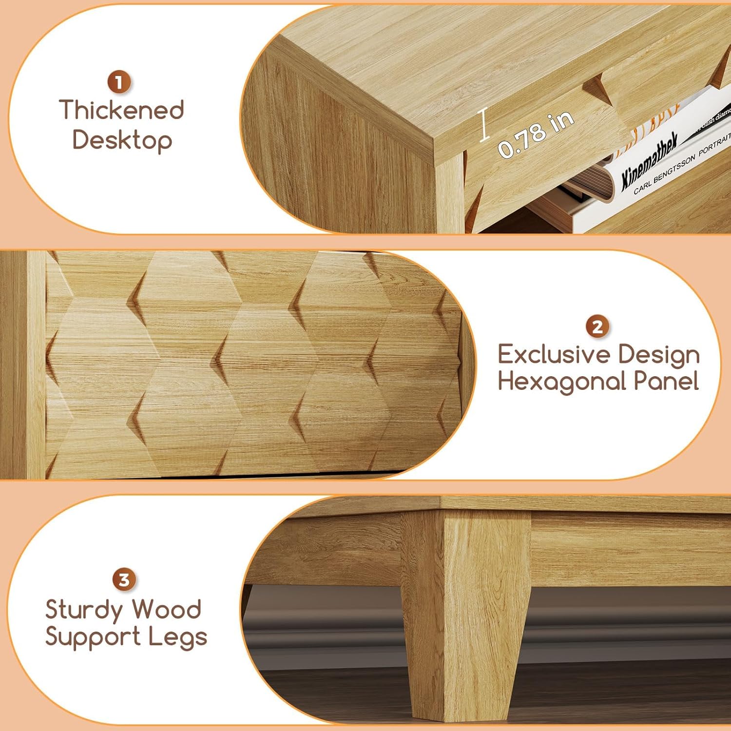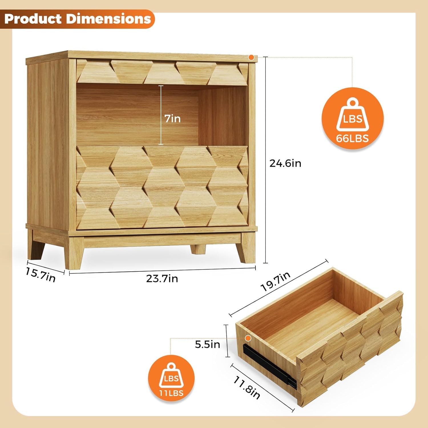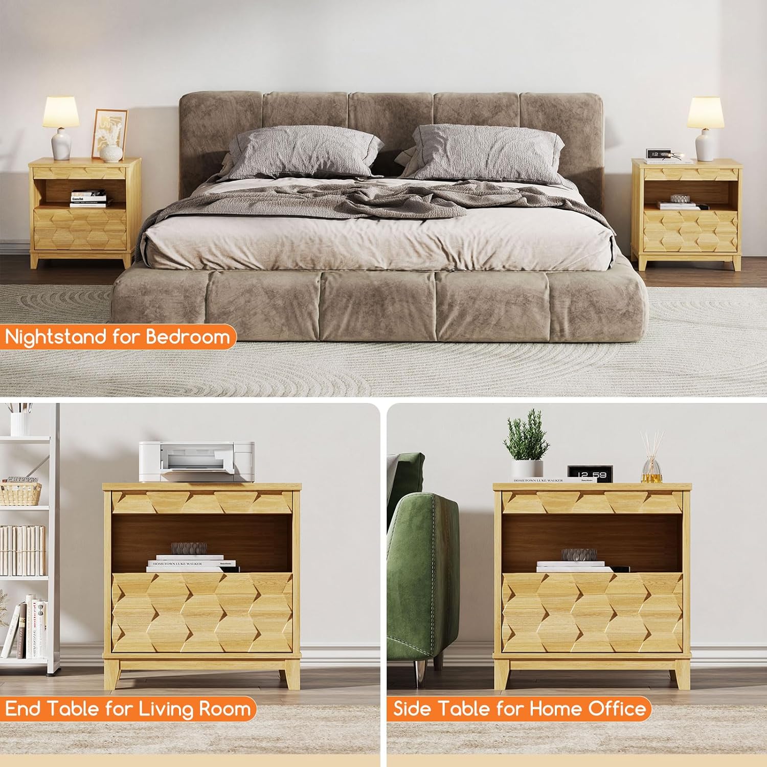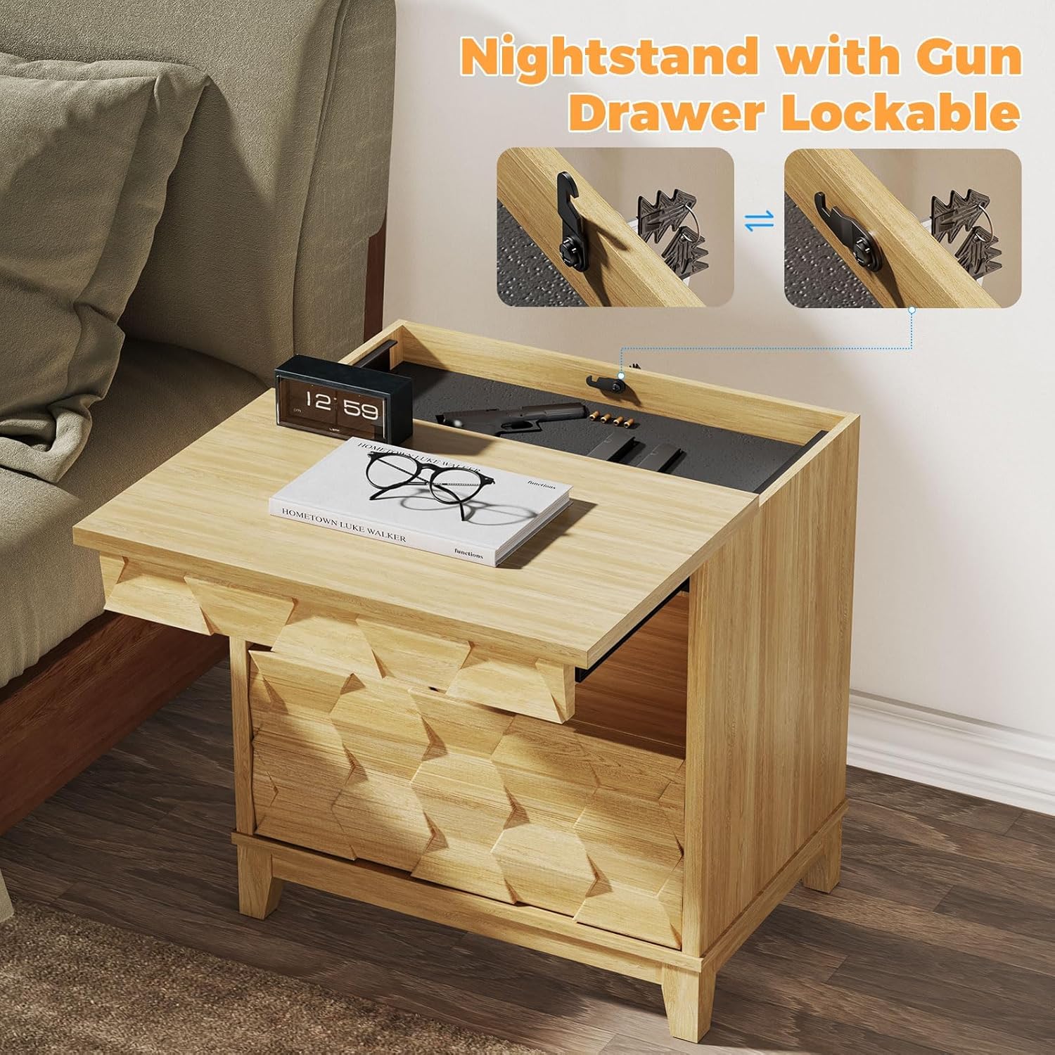24″ Wide Night Stand with Gun Drawer, Modern Fluted Bedside Table with Unique 3-Dimensional Craft, Wood Sofa Couch End Side Table for Bedroom Office, Natural