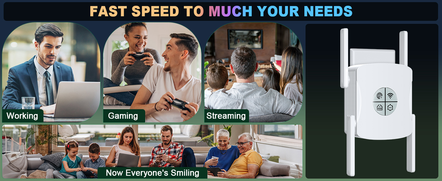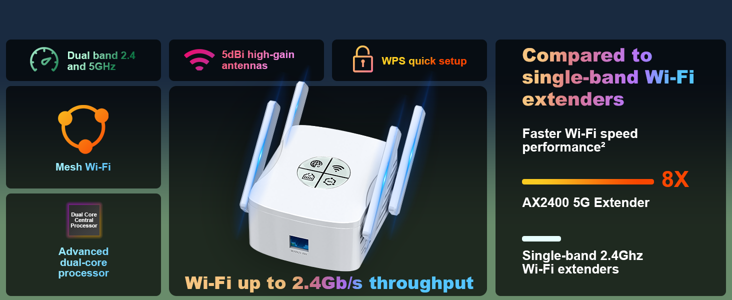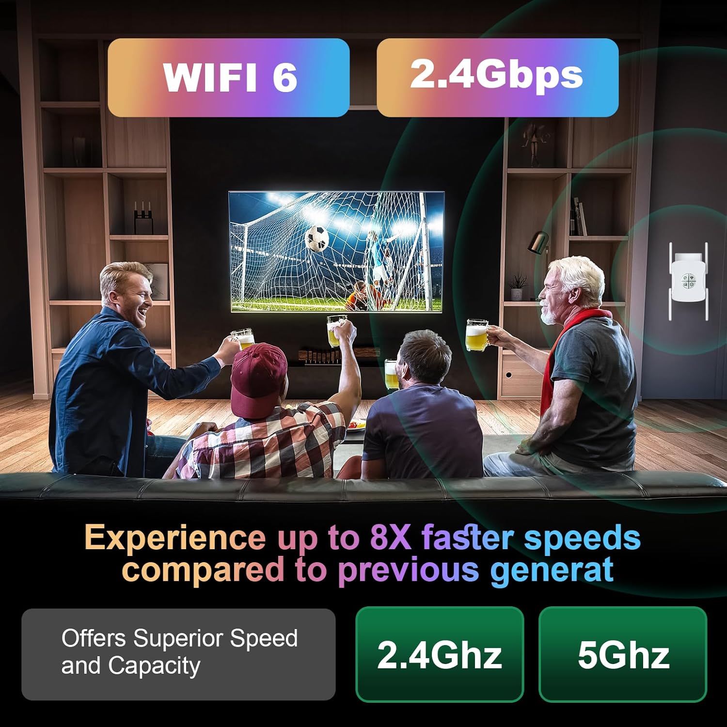 99+ DEVICES AT GIGABIT WI-FI 6 SPEEDS: Dual band WiFi 6 signal booster handles 99 simultaneous connections – game on PS5, stream 4K on 3 TVs, video-call via Laptop while Ring cameras upload 24/7. 8X faster than standard repeaters with 2400Mbps Fiber-ready bandwidth