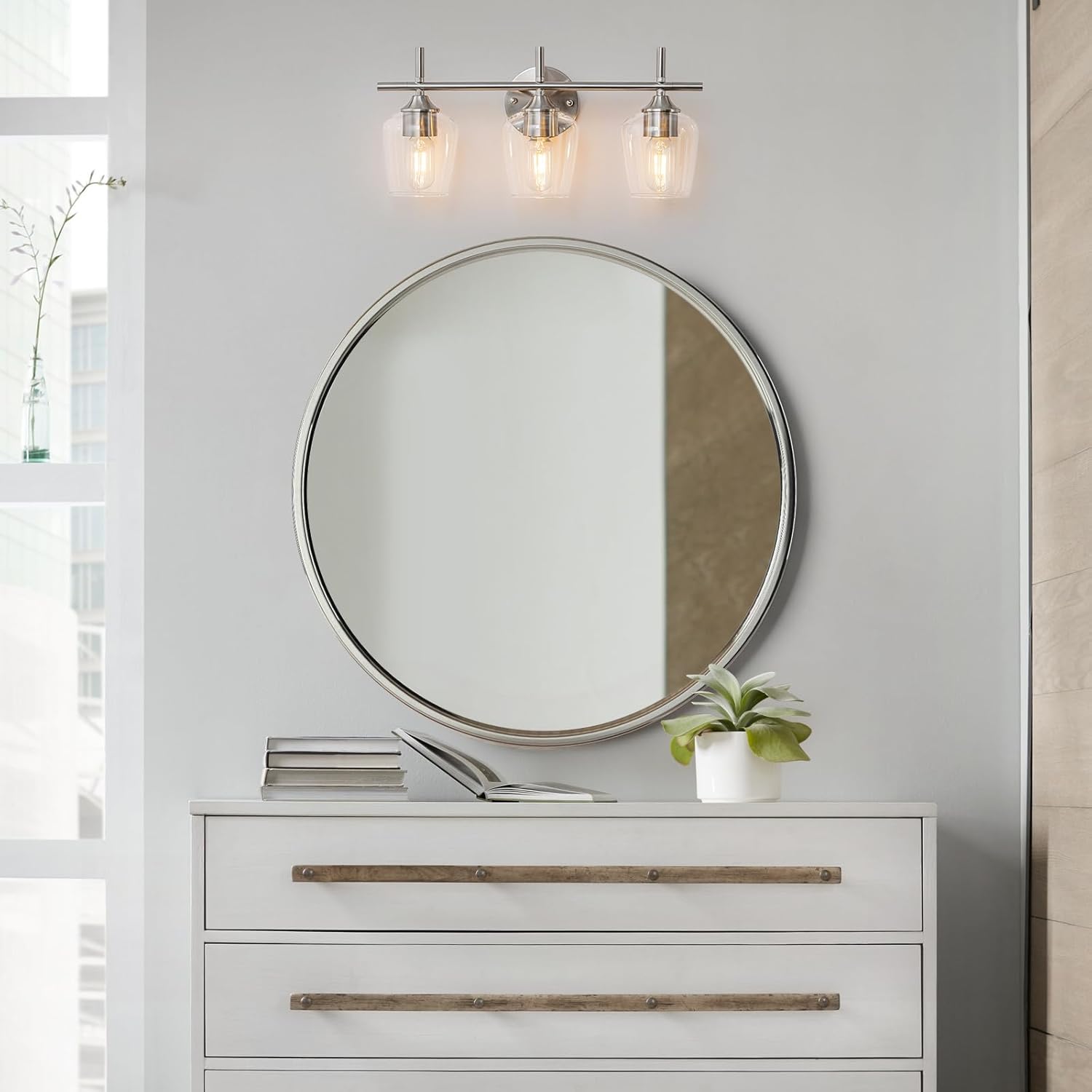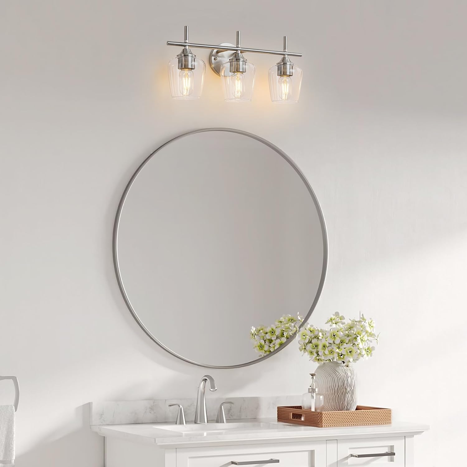 Modern & Durable Design: The bathroom vanity light fixtures is a unique brushed nickel design and elegant look. Featuring a sturdy metal body, rust-proof and will not fade. Clear wine glass shade softly diffuses light and adds timeless charm to your house