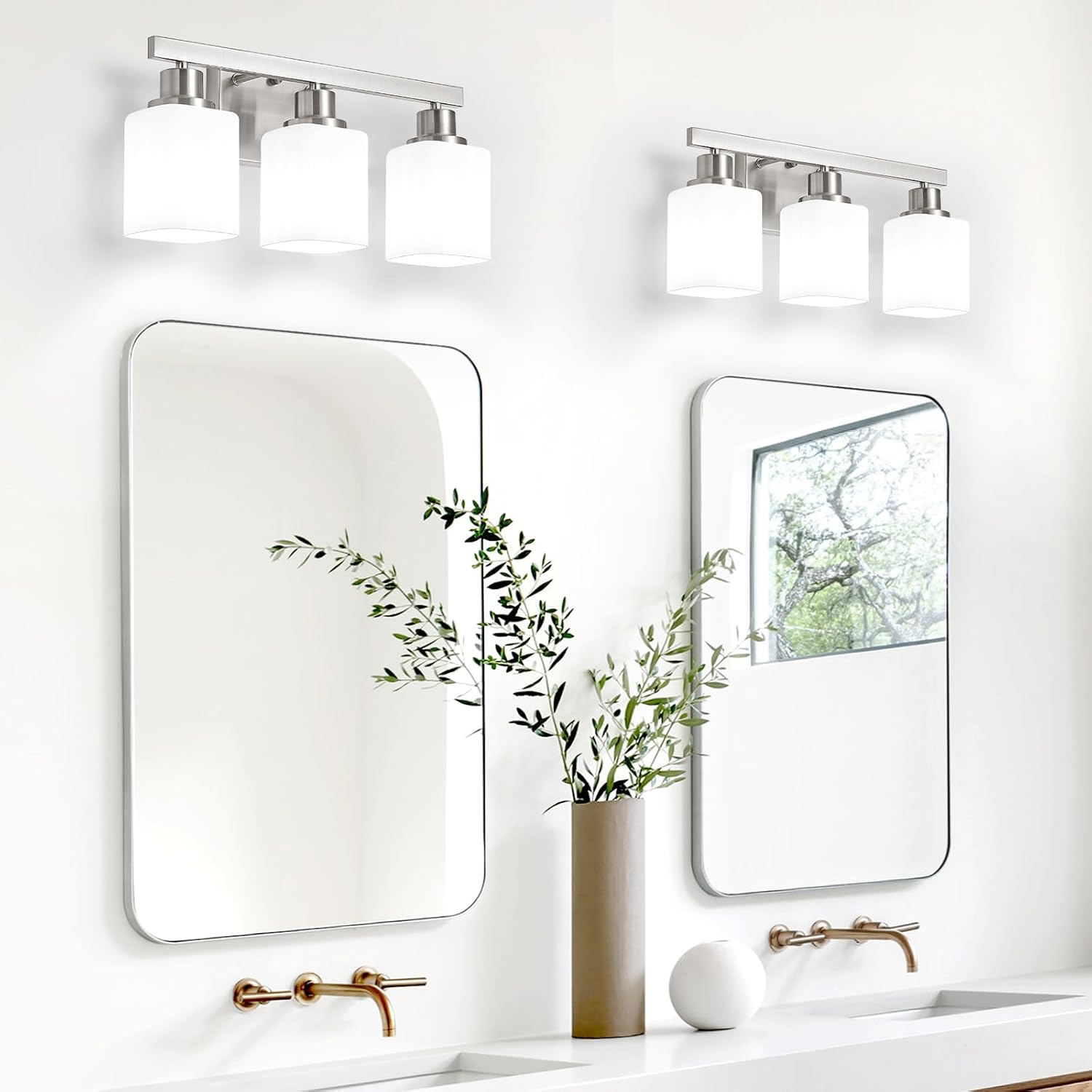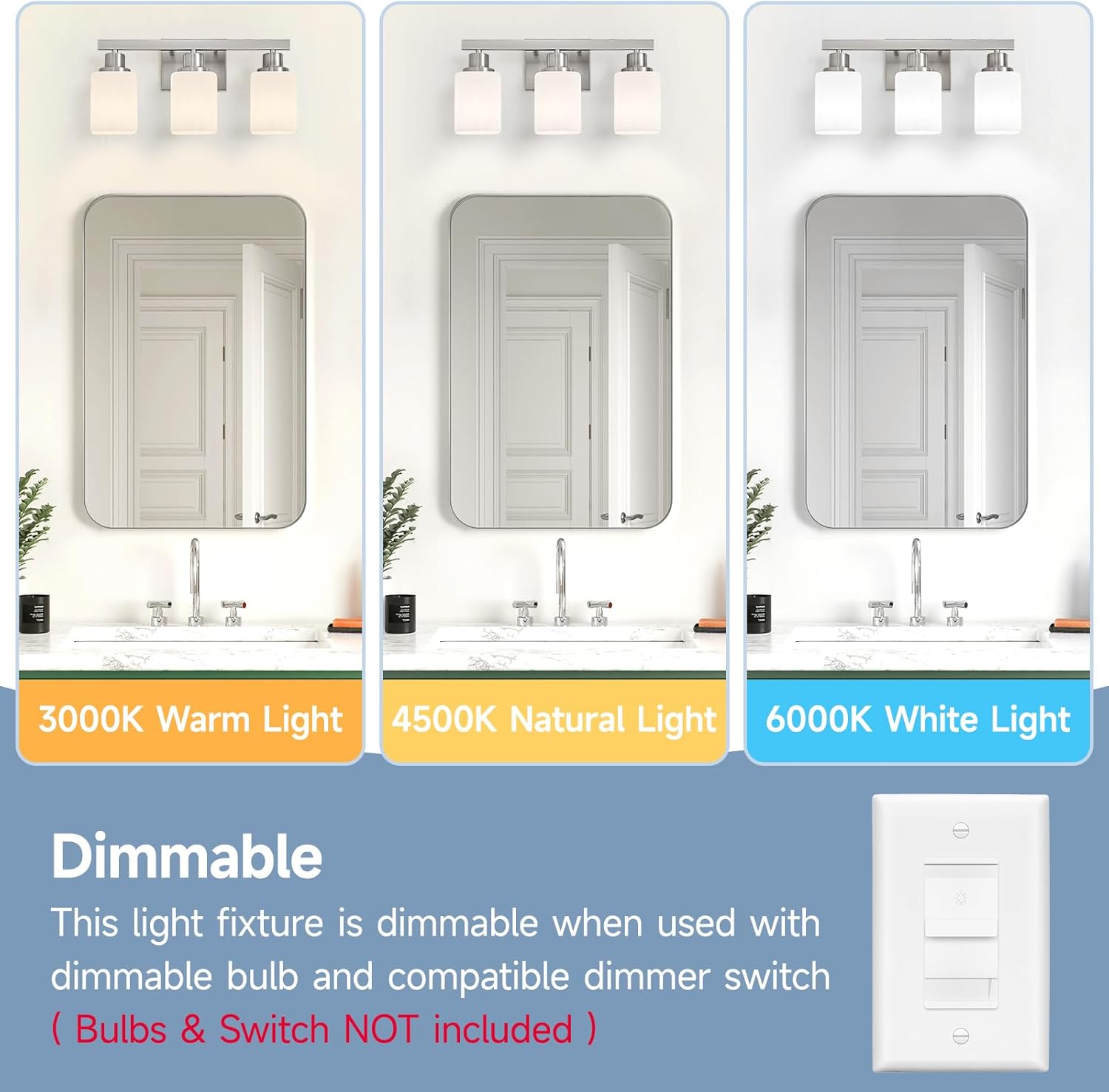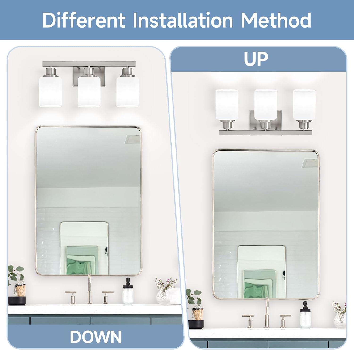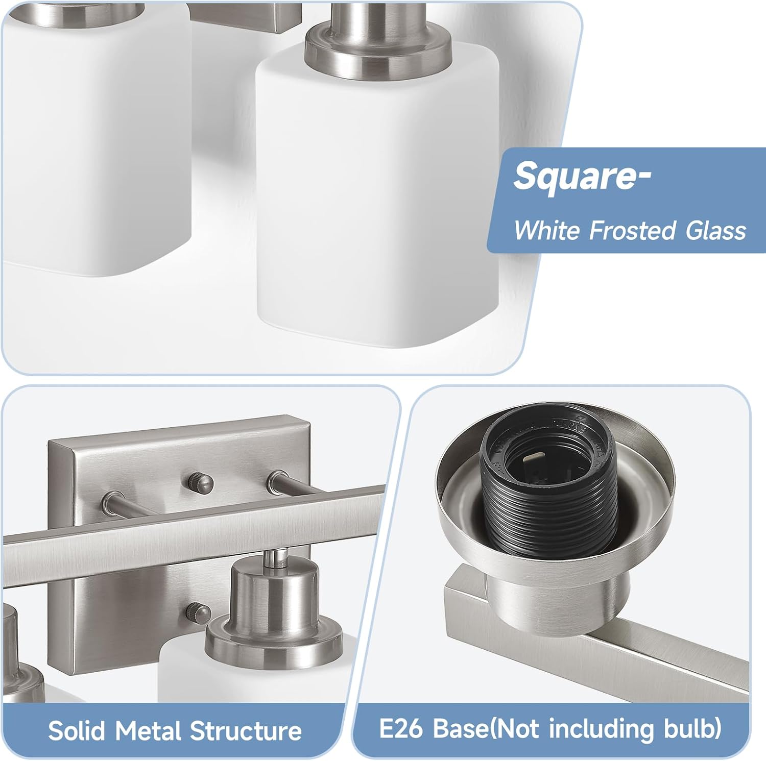 Robust Construction & Square Frosted Glass: Crafted from high-quality metal with a nickel finish, our 3 Light Bathroom Vanity Fixture ensures durability and resistance to oxidation and color fading. Bathroom vanity lamps with square frosted glass give people a simple, regular, and stable visual experience, and can create a harmonious and orderly atmosphere; suitable for a variety of home and commercial decoration styles such as modern minimalist style