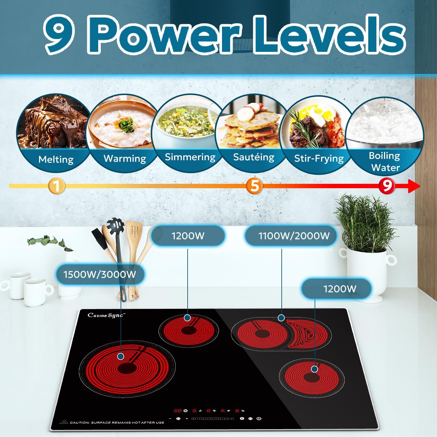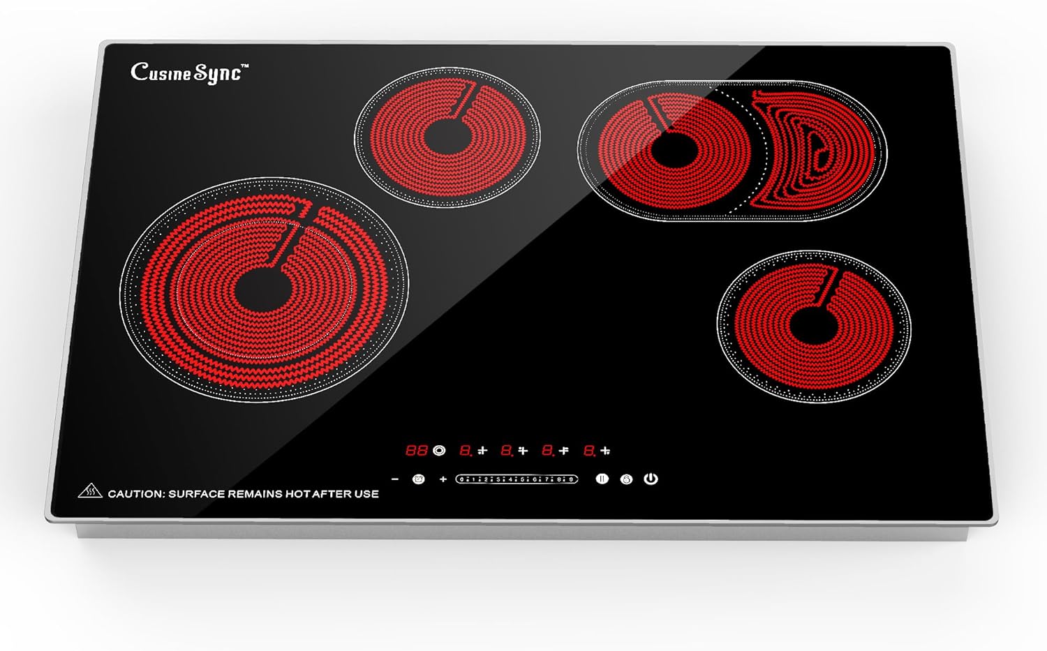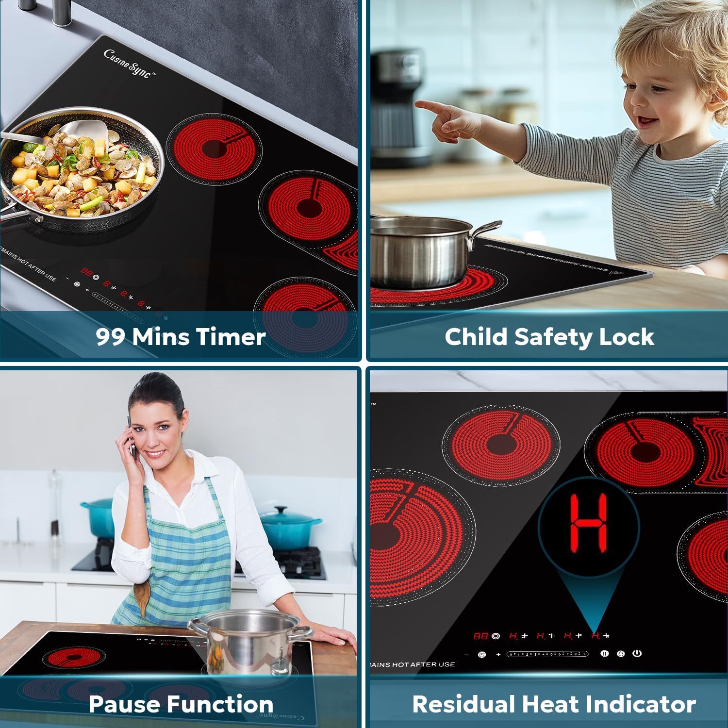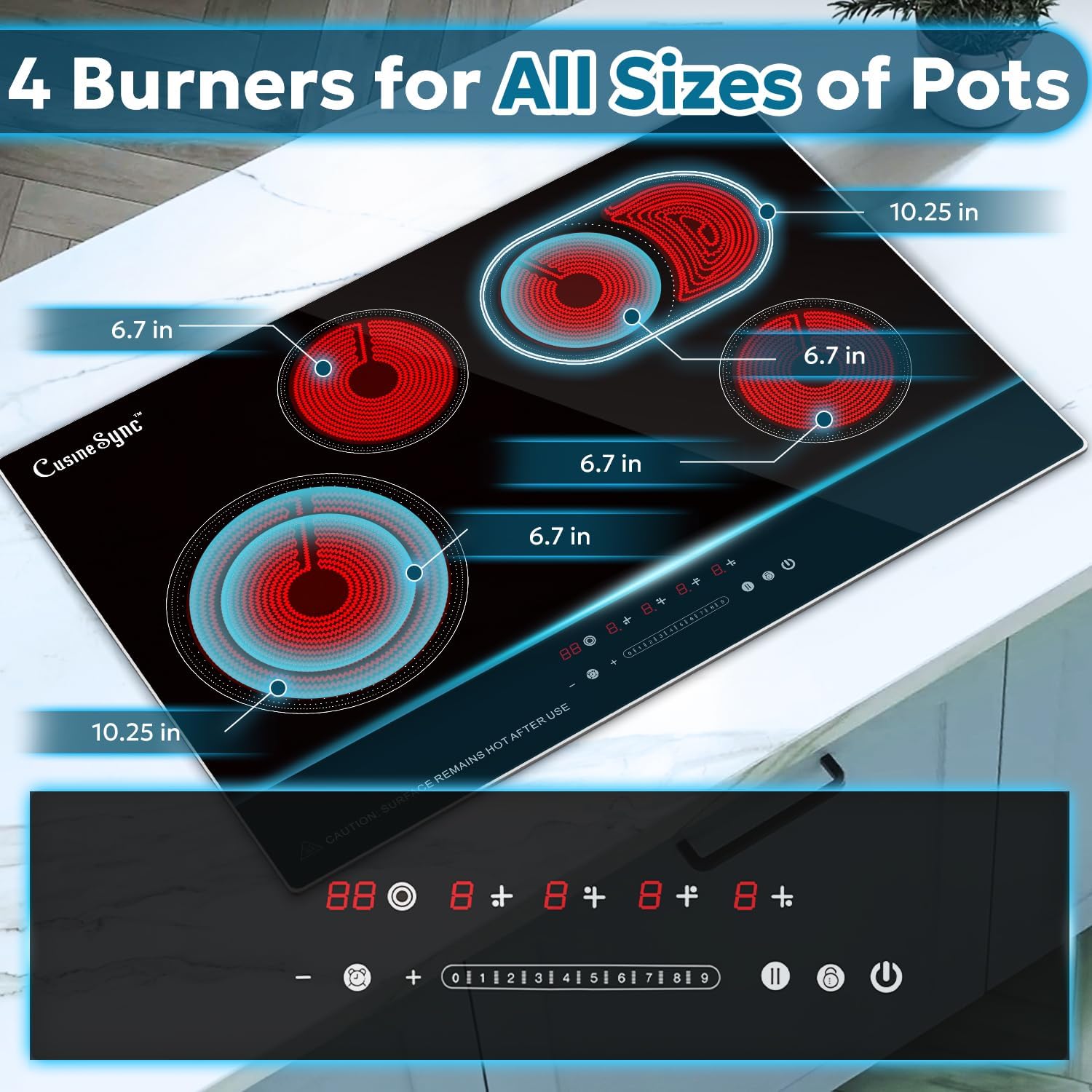 30 Inch Electric Cooktop 4 Burner 7400W Ceramic Stove, Built-in Electric Stove Top with Full Metal Frame Protection, Timer, Safety Lock, Pause, Dual Ring, 220V Hard Wired