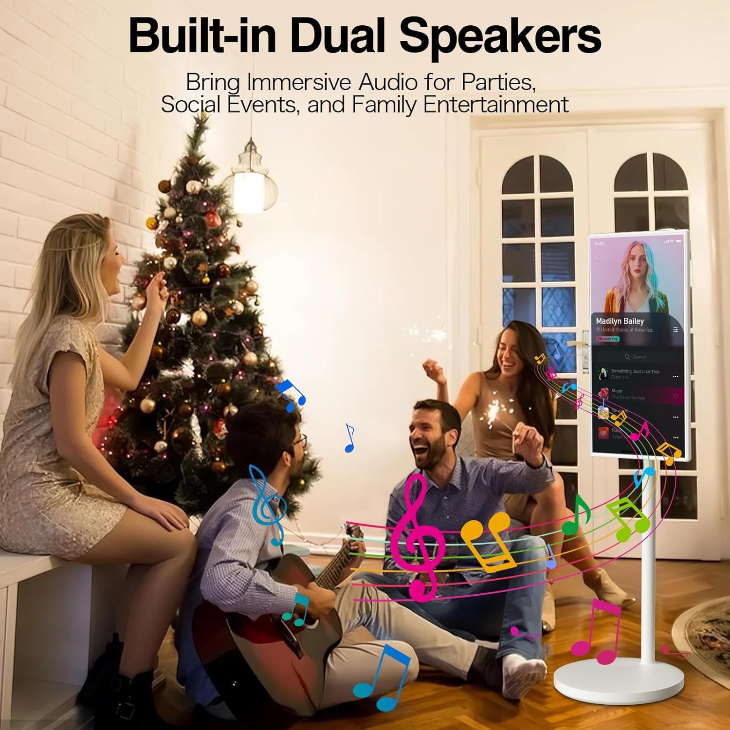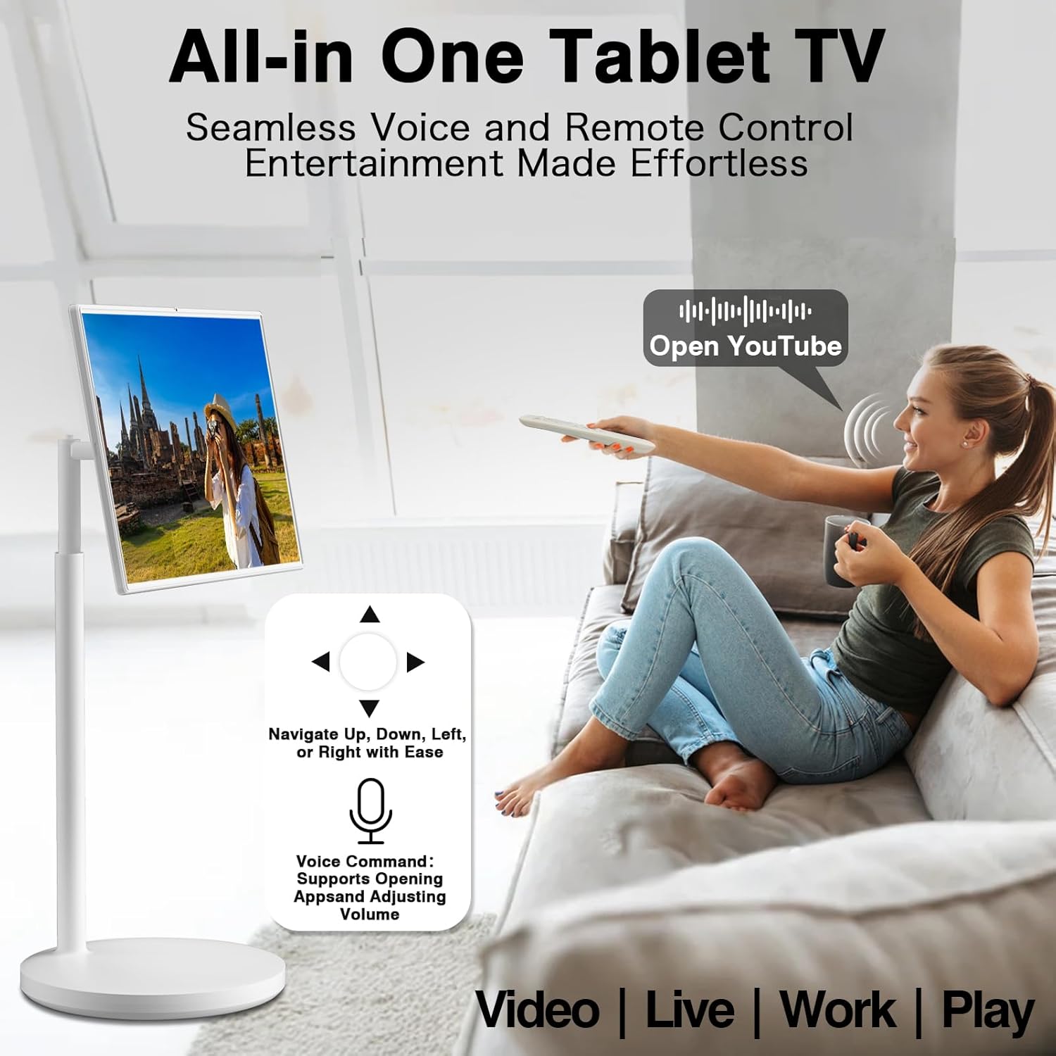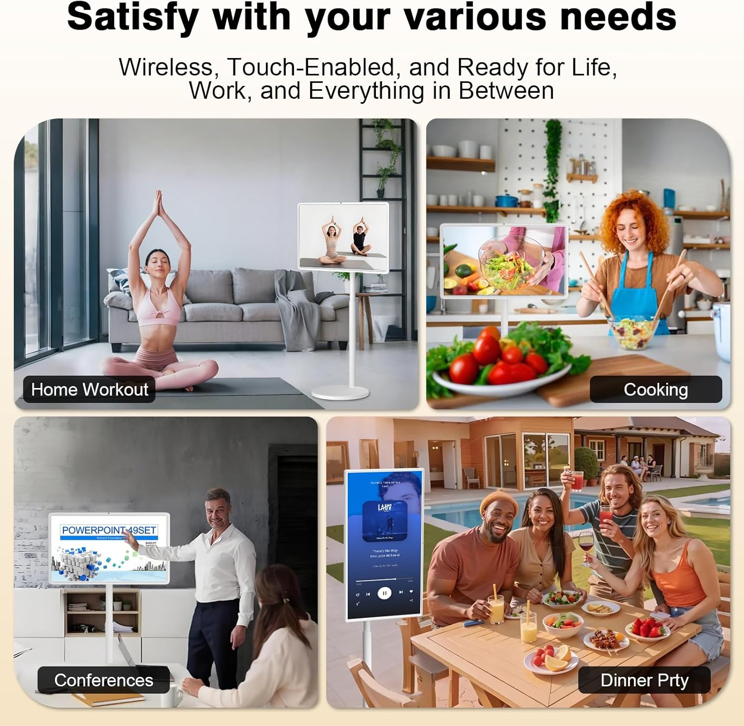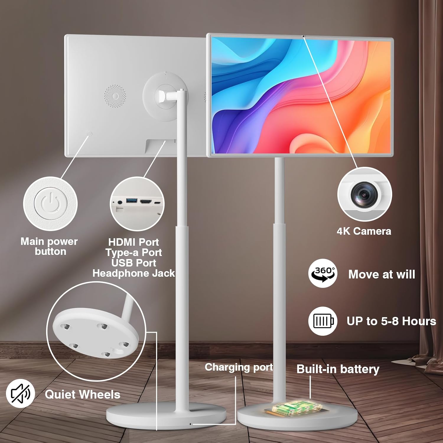 Rolling TV with Quiet Five-Wheel Base: For true mobile entertainment, this wheeled touchscreen portable TV features five quiet wheels for easy room-to-room mobility, whether used as a rolling TV or an outdoor portable TV, allowing you to enjoy content wherever you go, indoors or out. It’s a reliable mobile TV that’s always ready for use.