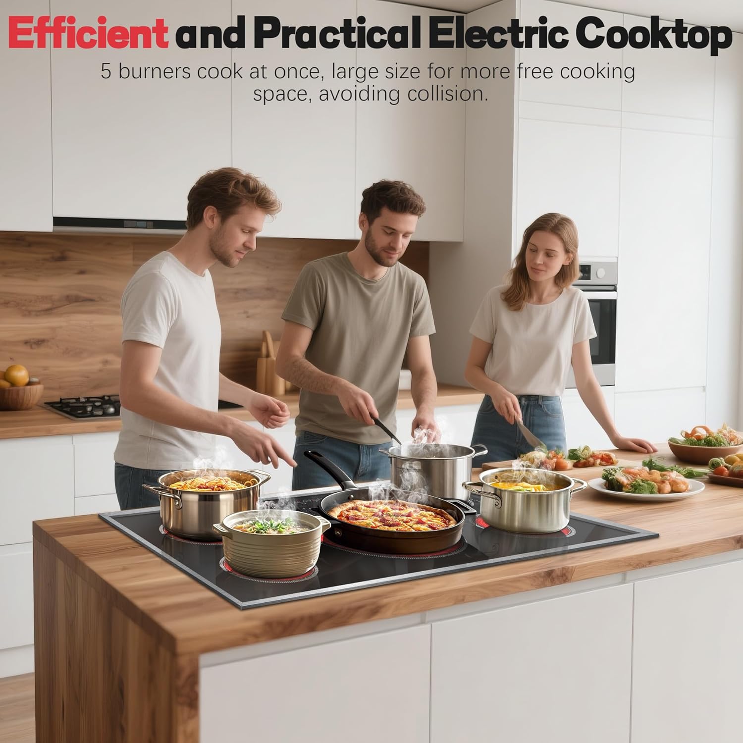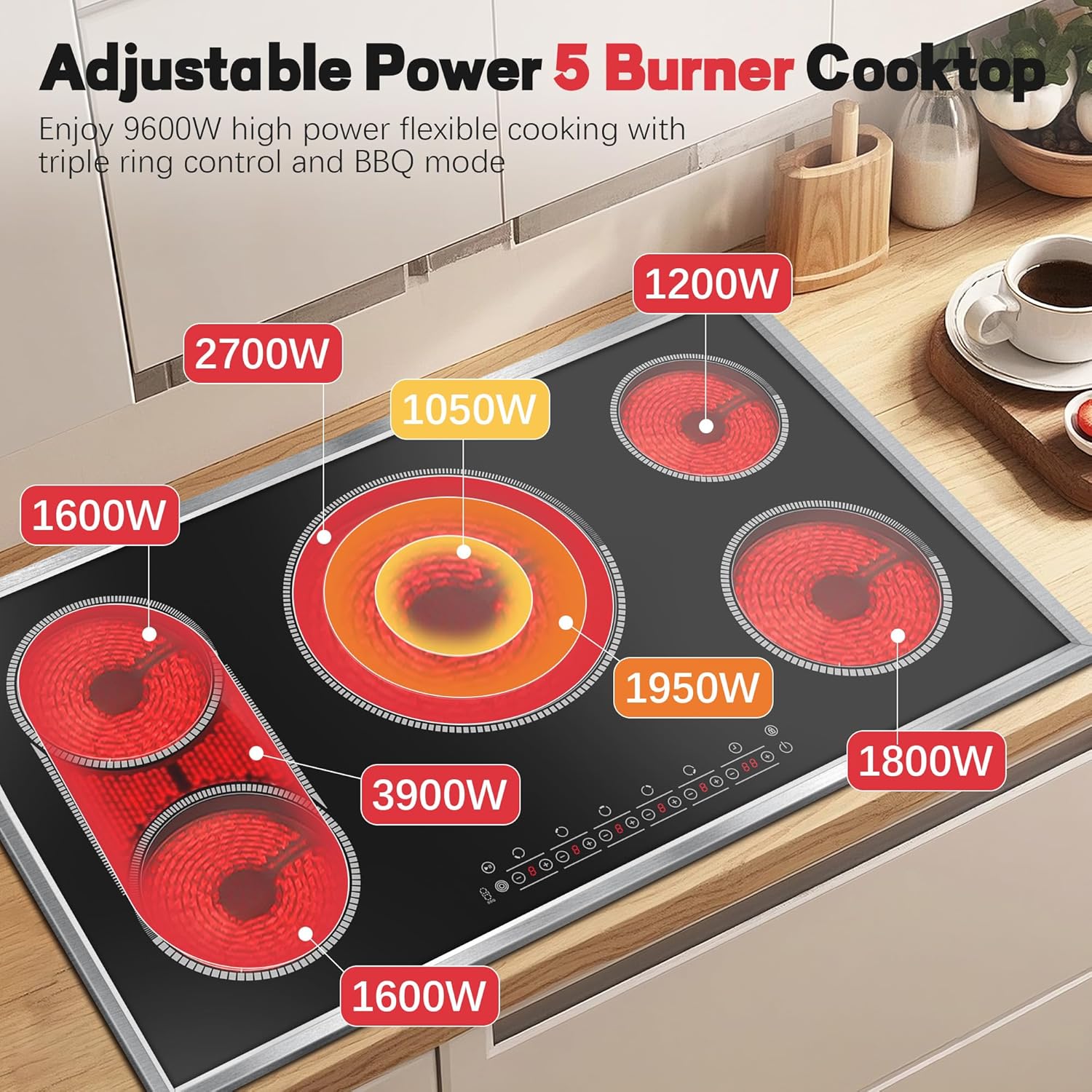 Professional 36-Inch Glass Ceramic Cooktop】This 36 inch electric cooktop features a premium 36-in glass ceramic surface with 5 high-performance electric stove top burners, delivering 9600W total power. The scratch-resistant, easy-to-clean design makes this 36″ cooktop perfect for modern kitchens.