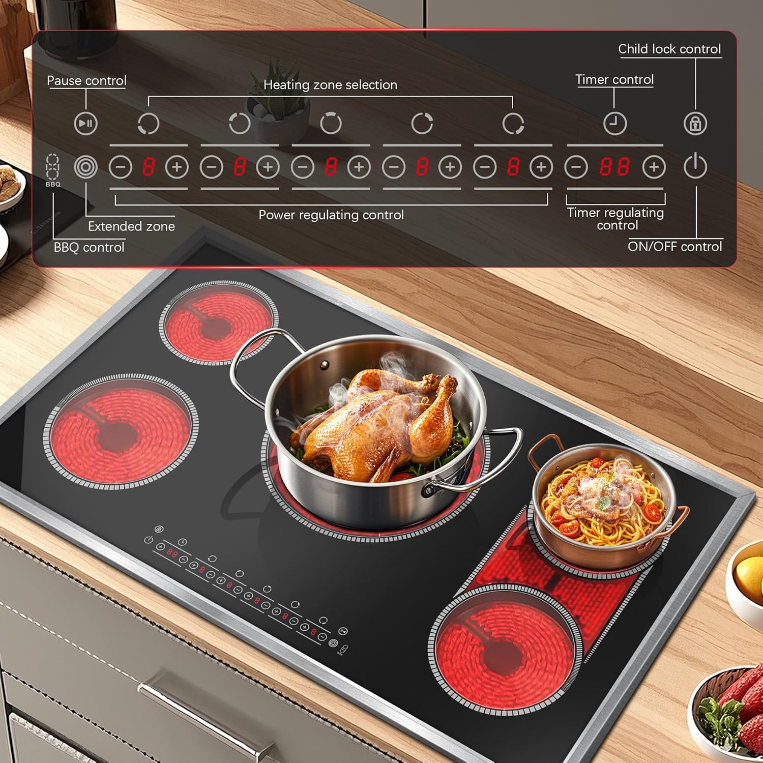 【BBQ Mode & Powerful Cooking Performance】Unlock outdoor-style cooking with dedicated BBQ Mode on this electric kitchen stove. Five independently controlled electric stove top burners provide optimal heat distribution for grilling, searing, or simmering.