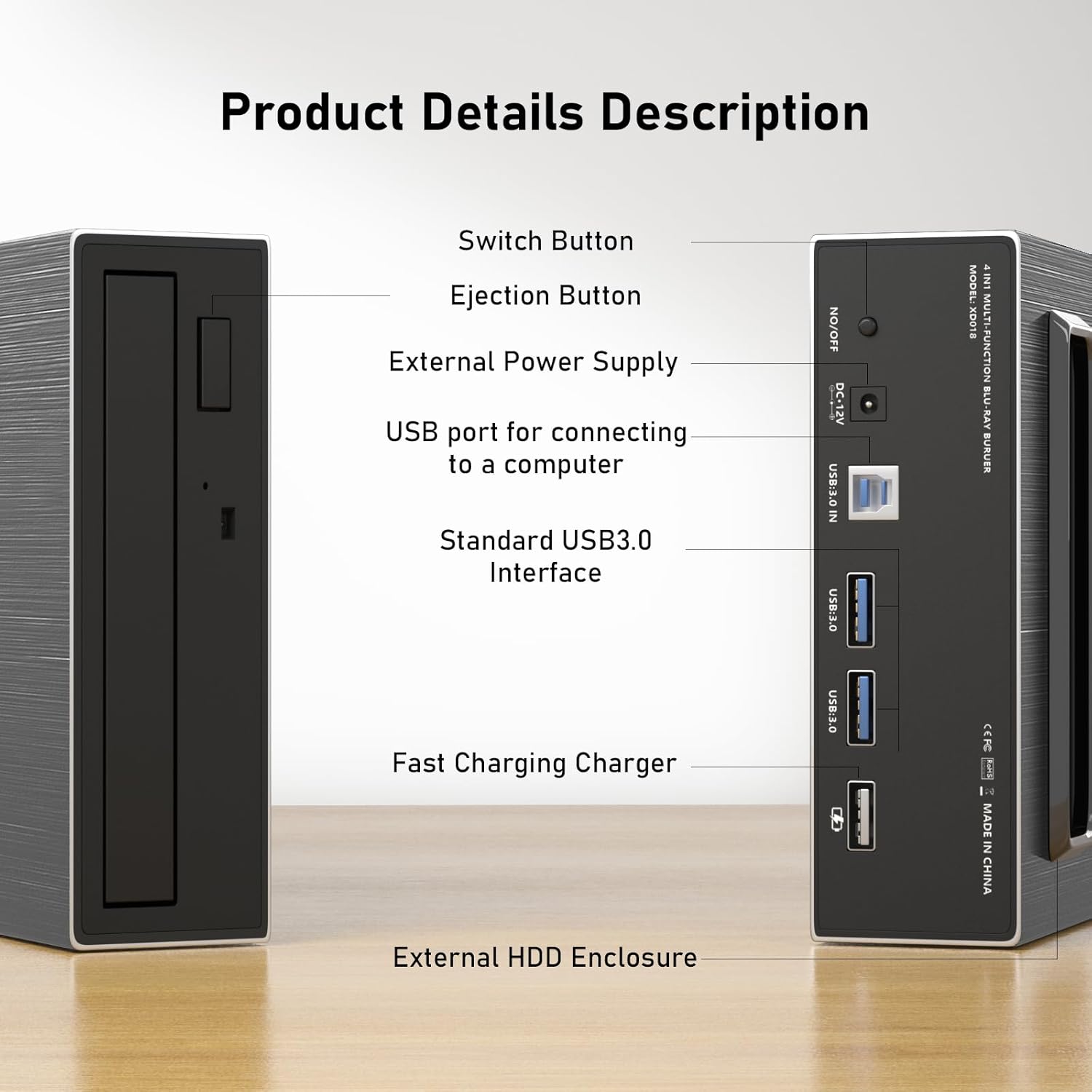 4 in 1 External Blu ray Drive, 16x USB 3.0 and Type-C External Bluray Drive, Multi-Function Fast-Charging Desktop BD/CD/DVD Burner/Read with HDD Enclosure USB HUB for Both Mac/PC