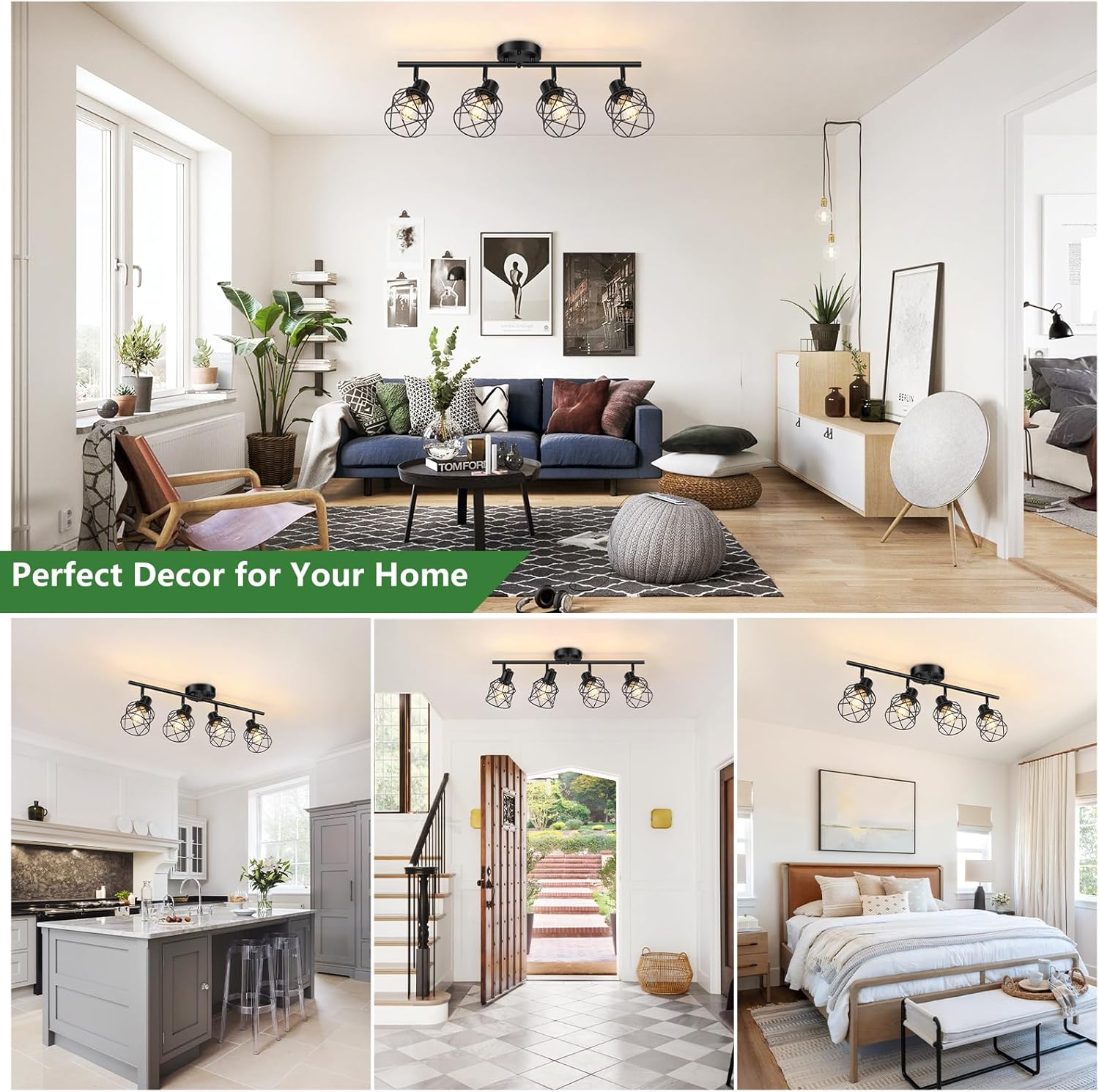 【Unique Farmhouse Light Fixtures】Baocuz 4-light multi-directional ceiling light is made of sturdy metal in matte black finish and wire cage, which is anti-rust and corrosion, super easy to clean, simple but sleek. Ideal ceiling lighting for indoors as a kitchen lights, hallway lights, living room lights, exhibition lights, dining table lights, bedroom lights, foyer lights, etc.