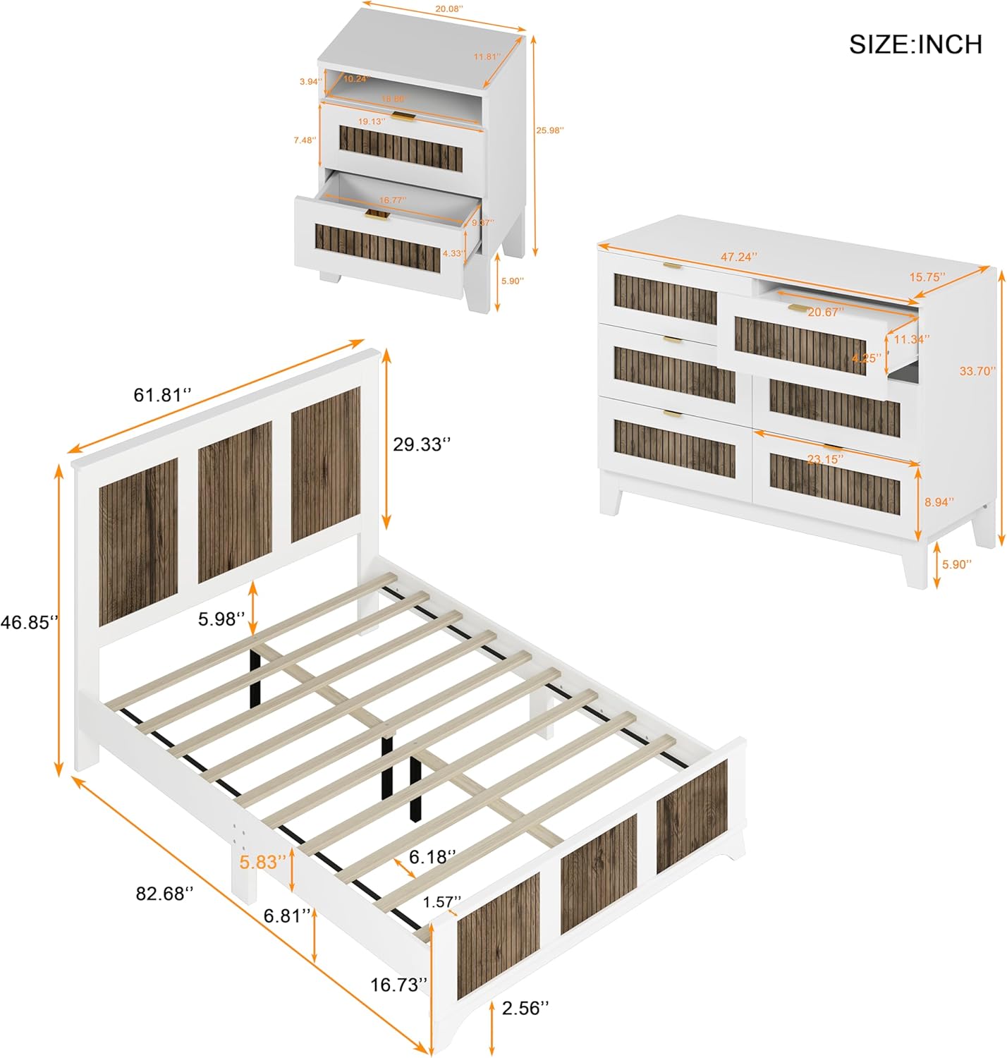 【Dimensions and Assembly】 Queen Bed Dimension: 82.68″L X 61.81″W X 46.85”H. Nightstand Dimension: 20.08″L x 11.81″W x 25.98″H. Dresser Dimension: 47.24″L x 15.75″W x 33.70″H. Some simple assembly is required, clear and detailed instructions and all necessary tools are provided. Warm Notice: This Item comes in 4 Boxes which may not come together. Please feel free to tell customer services if any issues, we will help you to solve the problem ASAP.