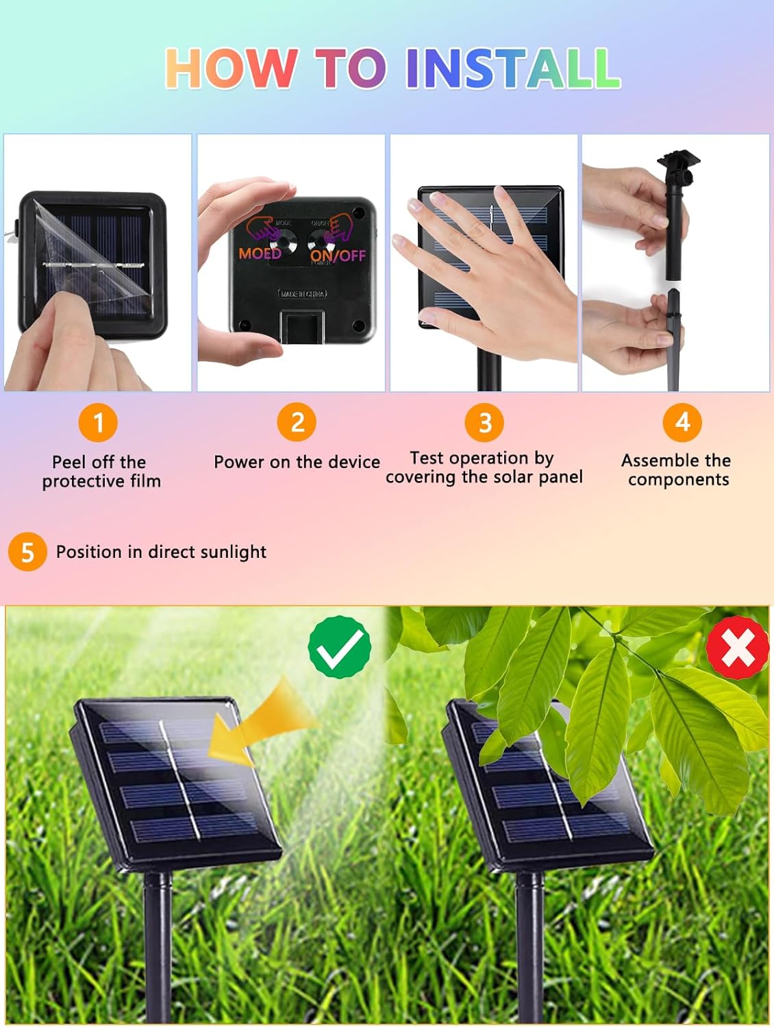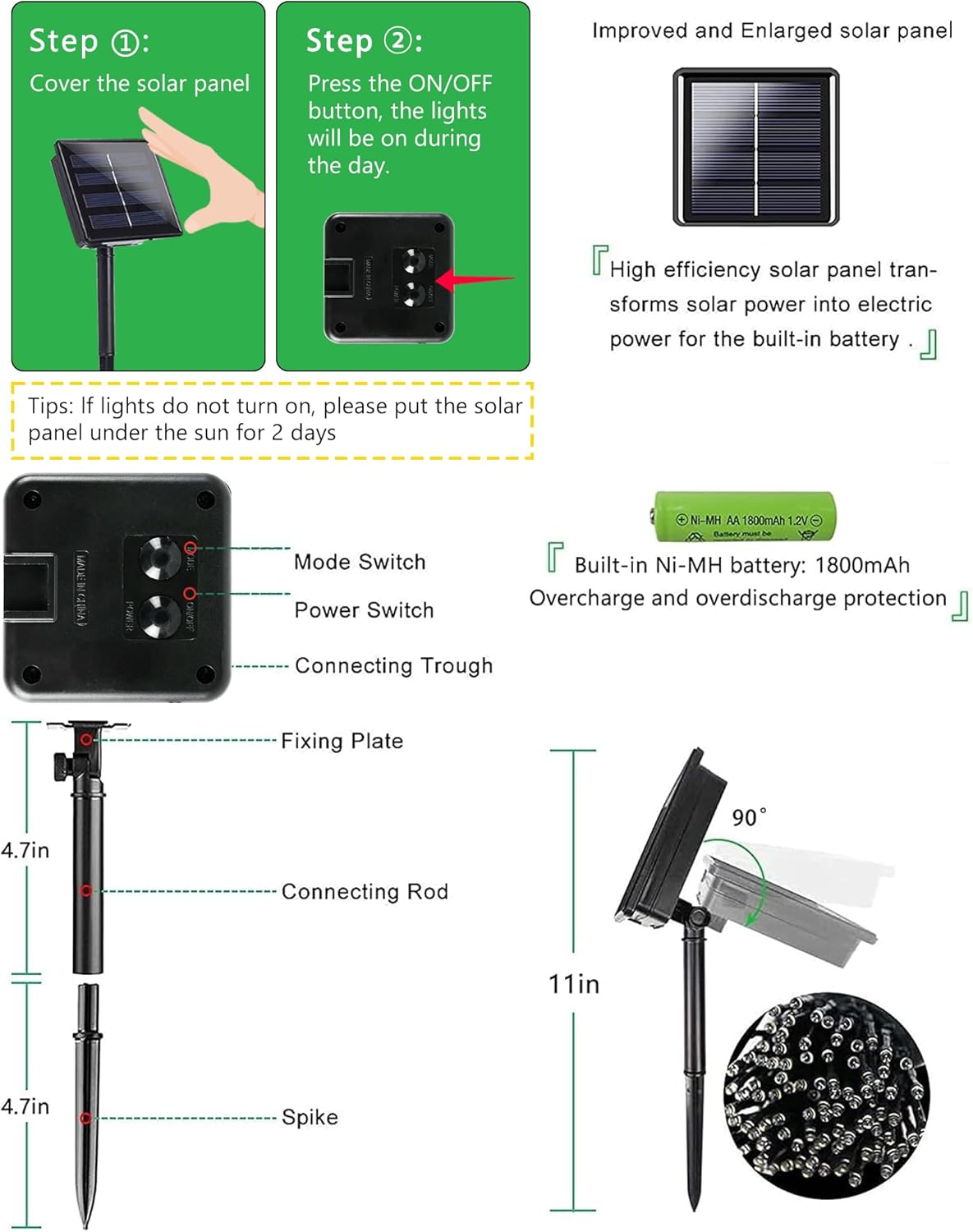 Waterproof Solar Tree Lights and Easy to Install: With an IP65 waterproof design, the solar powered Christmas lights can withstand all kinds of weather and are a great choice for outdoor decorations, such as porch, roof, tree, yard and fence. And the lights can be installed easily—simply attach the ground stake to the solar panel and place it in a sunny spot