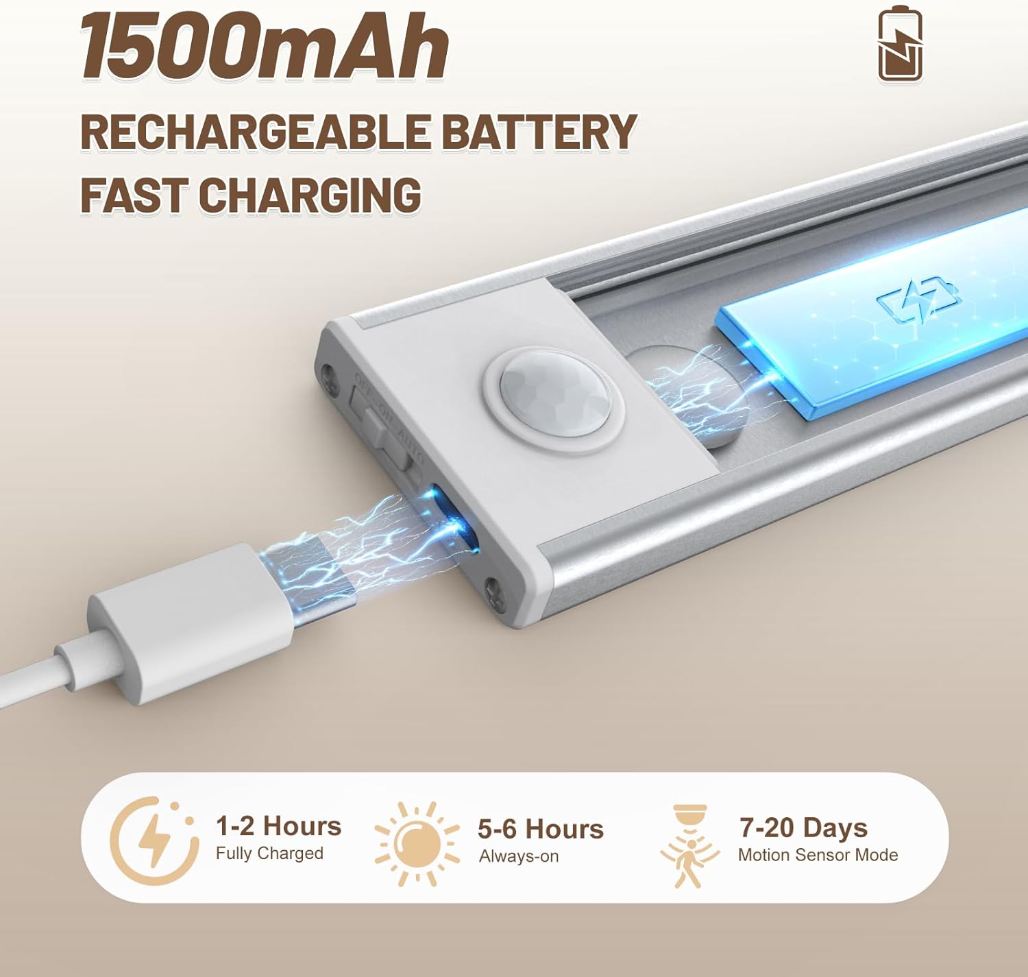 USB-C Rechargeable Light: The under counter lights for kitchen have a built-in 1500mAh rechargeable battery, no need to worry about wiring like other styles, it can be quickly charged via Type-C cable. The closet lights maximum brightness can be used for about 5 to 6 hours of continuous use or up to 7-20 days in sensor sensing mode (depending on how often you use it) (Please charge before first use) It only takes 1-2 hours to fully charge