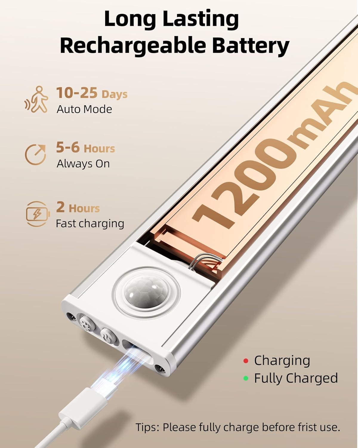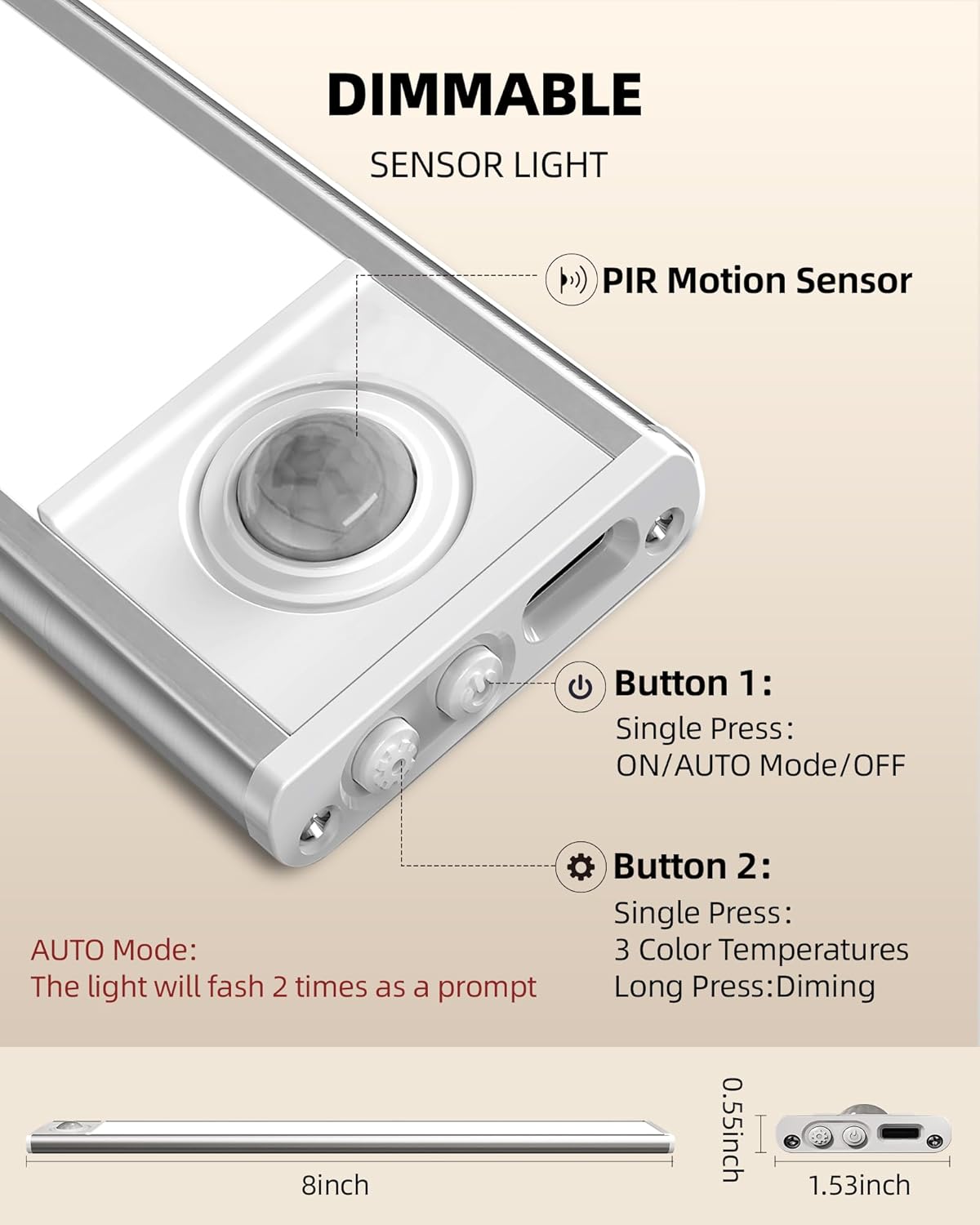 6-Pack Under Cabinet Lighting Wireless, LED Motion Sensor Light Indoor, Rechargeable Closet Lights Battery Operated, Dimmable & 3 Color Temps, Under Counter Lights for Kitchen, Stairs (8inch)