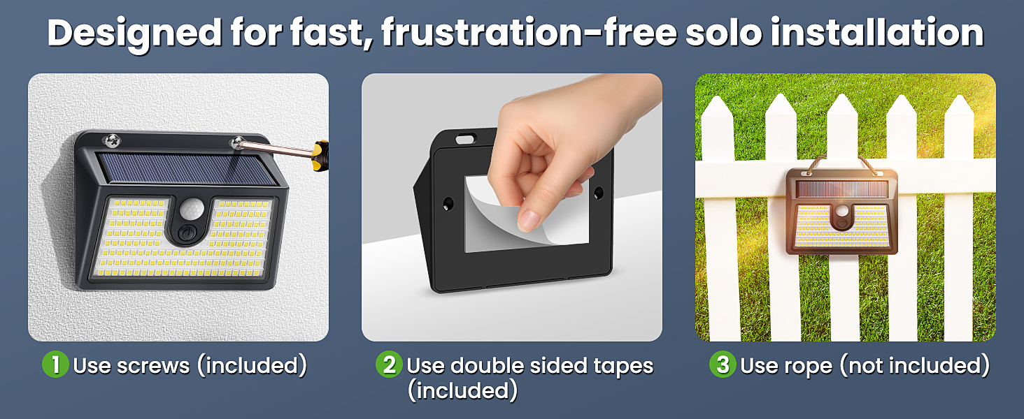 🔧【 Effortless Installation & 2-Year Warranty for Worry-Free Use】Installation is quick and easy with multiple mounting options (screws, double-sided tape, rope). Backed by a 2-year warranty and a 60-day no-questions-asked return policy, you can purchase confidently, knowing you’ll enjoy hassle-free outdoor lighting for years to come.