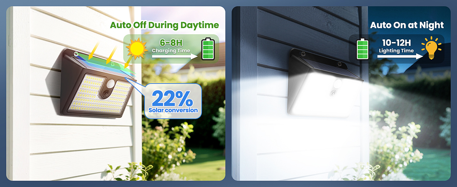 ⚡【Faster Charging & Longer Runtime for Continuous Illumination】Featuring a 22% high-efficiency solar panel, our solar motion lights charge faster and last longer, even on cloudy days. The durable ABS material construction ensures these lights stay strong over time, addressing common issues of dimming and failure seen in other lights. Enjoy efficient, long-lasting illumination with no electricity bills!