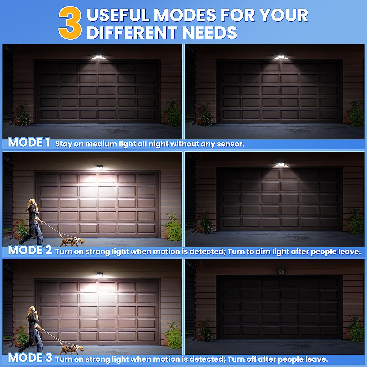 💡【3 Smart Lighting Modes & IP65 Waterproof】Choose from 3 lighting modes to suit your needs: ① Medium Light Constant On Mode (30% brightness, stays on all night) ②Dim Light Sensor Mode (low brightness, activates to 100% with motion) ③Strong Light Sensor Mode (100% brightness with motion, turns off after 20s). With an IP65 waterproof rating, these lights can withstand all weather conditions, including rain, snow, and extreme temperatures, ensuring reliable outdoor lighting year-round.