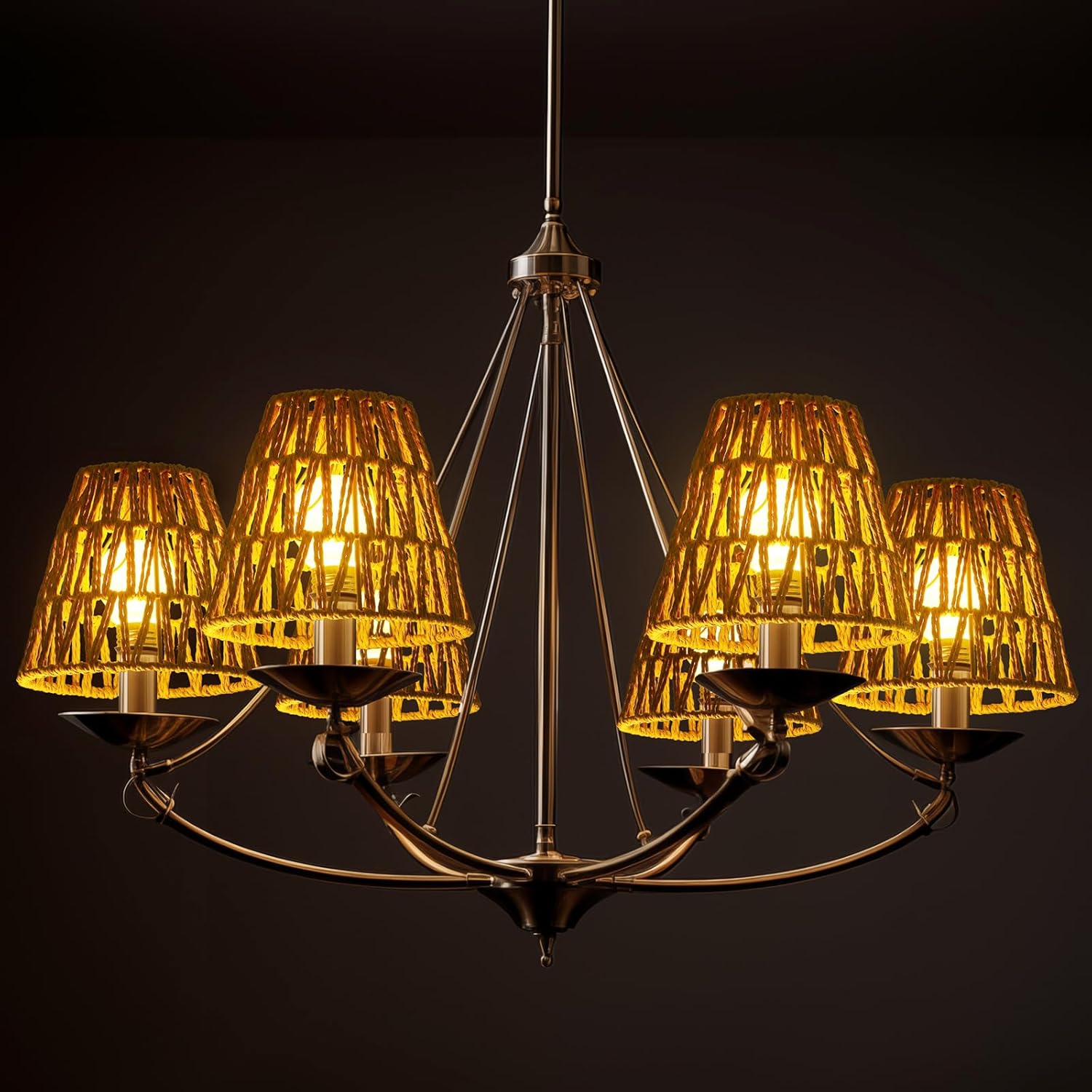 Experience a mix of tradition and modernity with our 6 small lamp shades set. Crafted using quality natural rattan and sturdy metal, our lampshades create warm, inviting lighting for your home. Each lamp shade features a Bohemian styled, handwoven design, certain to add charm and a touch of rustic elegance to any living space.