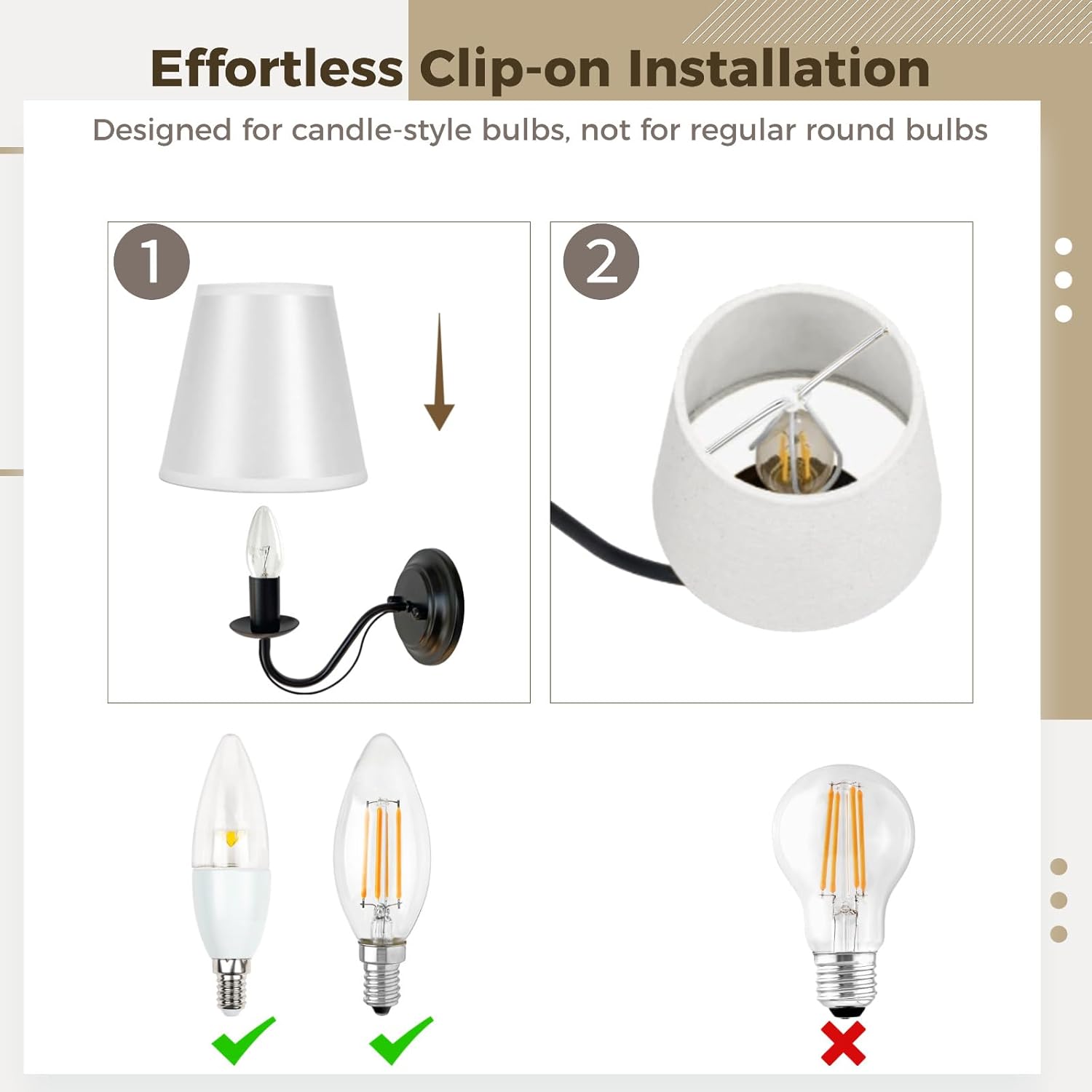 Effortless Clip-on Installation: Designed for candle-style bulbs; just clip onto the bulb for quick setup; suitable for chandeliers, wall sconces, bedside lamps and similar fixtures needing a fast, stylish update.