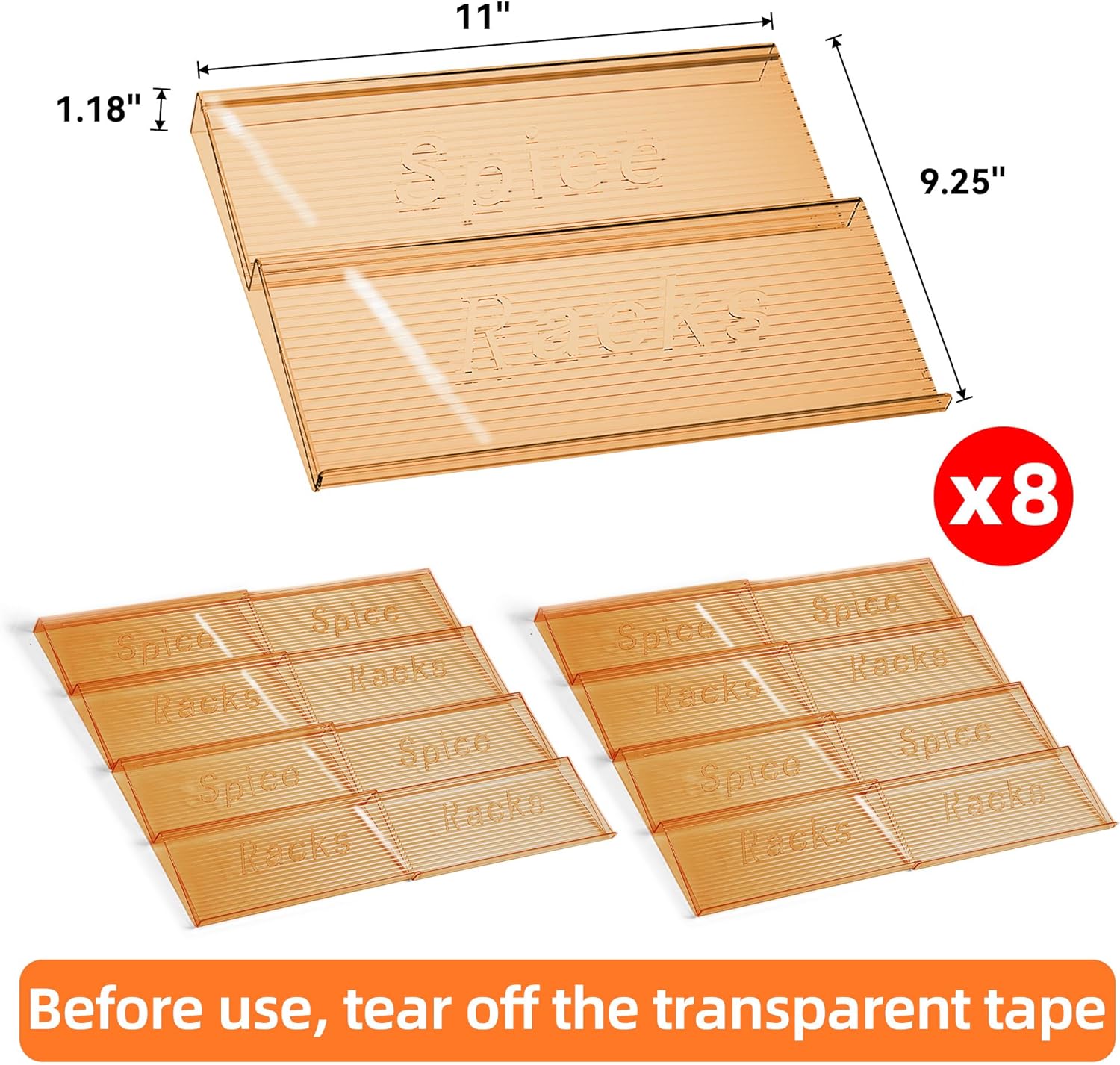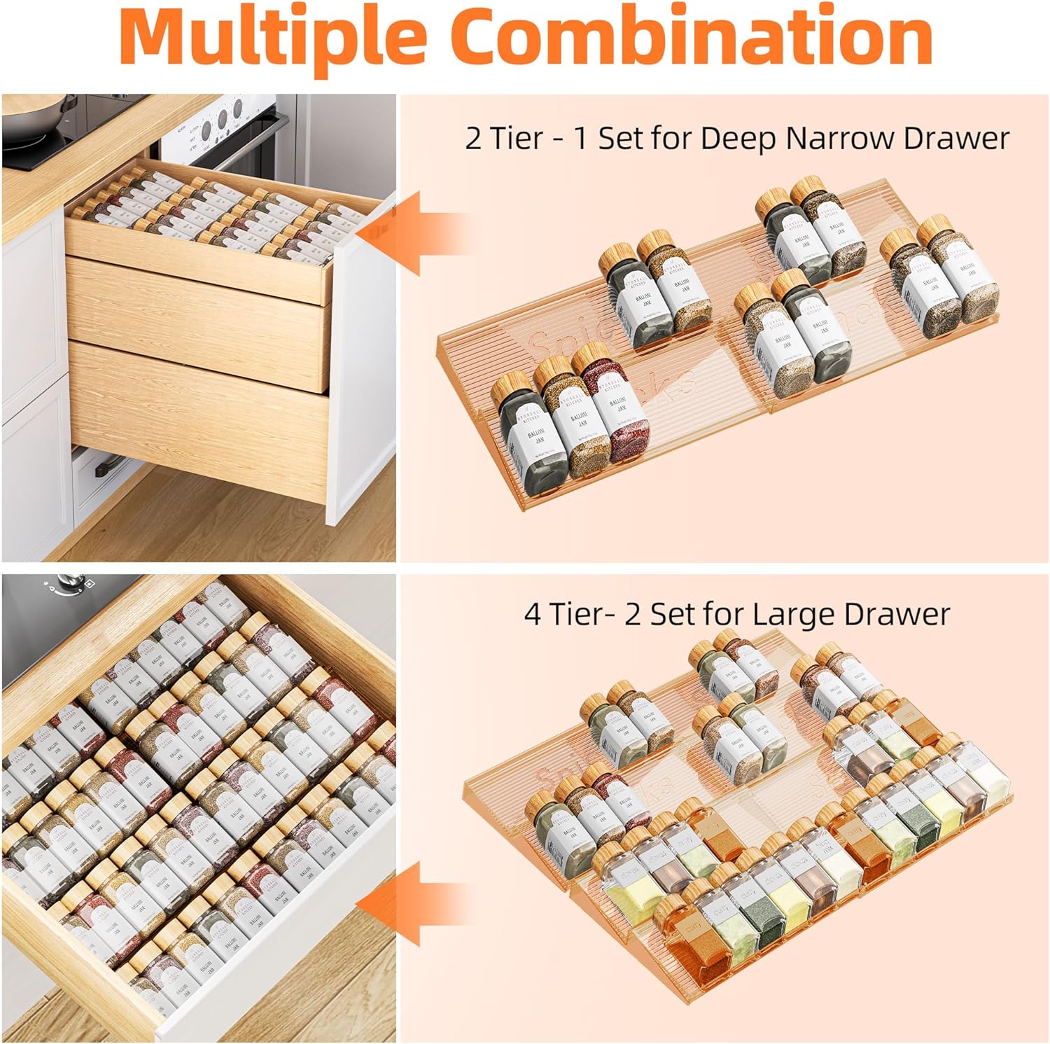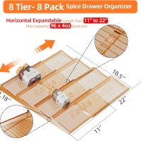 Customize Your Spice Storage: Enhance your culinary space with our spice rack that adapts to your needs. This horizontally expandable spice organizer is designed to fit drawers from 10.63” to 42.04” in width. Opt for the compact 2 Tier- 2 Pack for shallower drawers or maximize your capacity with the 4 Tier- 4 Pack for deeper storage options. And this 8-pack is suitable for particularly large drawers and can be stored in 2-3 drawers at a time. Create a seamless spice solution tailored to your kitchen