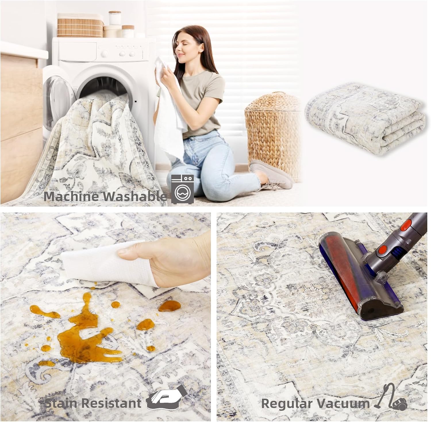 8×10 Area Rugs Washable Rug: Large Living Room Rug Stain Resistant Distressed Vintage Boho Carpet Non Slip Low Pile Faux Wool Soft Rugs for Bedroom Bedside Indoor Farmhouse Kids Playroom Dining Room