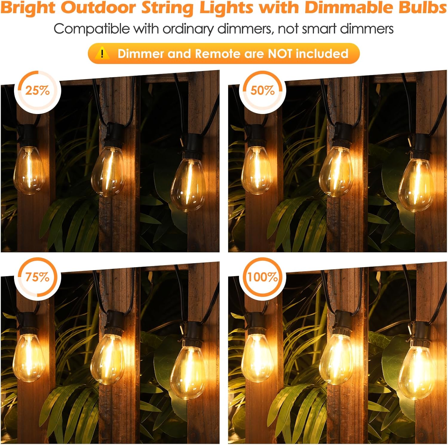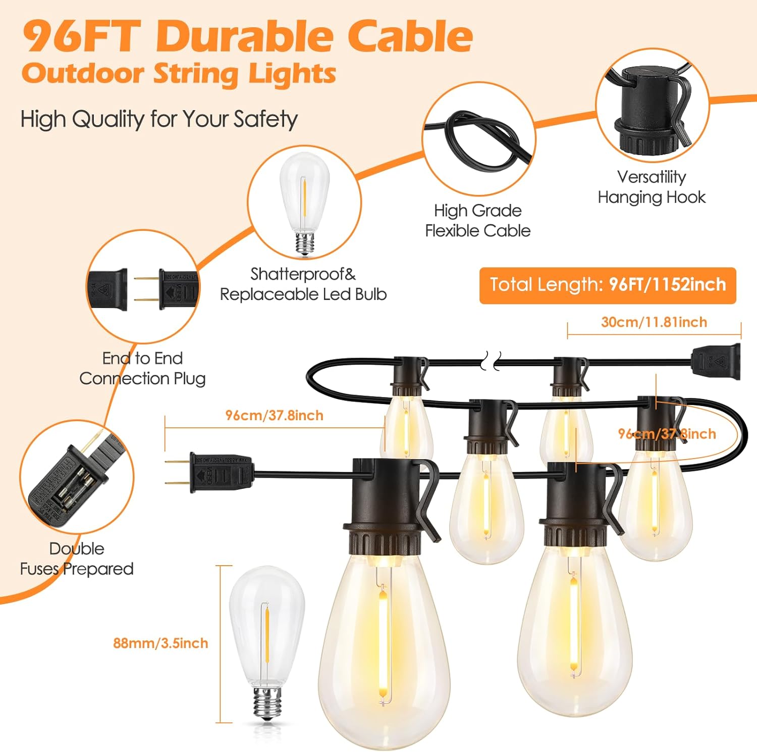 Dimmable LED Patio String Lights: Our vintage 96 ft LED string lights come with 32 Edison clear look LED bulbs, 2 spare, compatible with most standard dimmers with upgraded technology, can be brightened or dimmed for better mood lighting flexibility, from 0% smooth dimming to 100%. Customizable lighting experiences add a warm and inviting glow to create a cosy and inviting atmosphere for your family reunion, party, and indoor and outdoor spaces. Note: Dimmer and Remote are not included