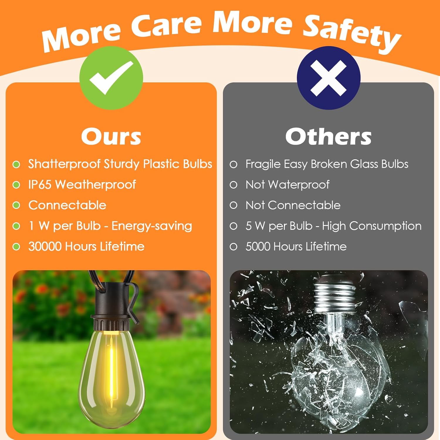 Commercial Grade IP65 Waterproof & Shatterproof: Designed for outdoor use, our durable patio lights are weatherproof and built to withstand the elements like wind, rain, snow, and extreme hot/wet temperatures. Hard anti-drop plastic bulbs are safer than fragile glass bulbs, protect you and your family’s health, no more worry about the broken glass shards. Also come with a built-in spare fuse inside the plug for easy replacement. They will shine brightly and beautifully throughout the seasons