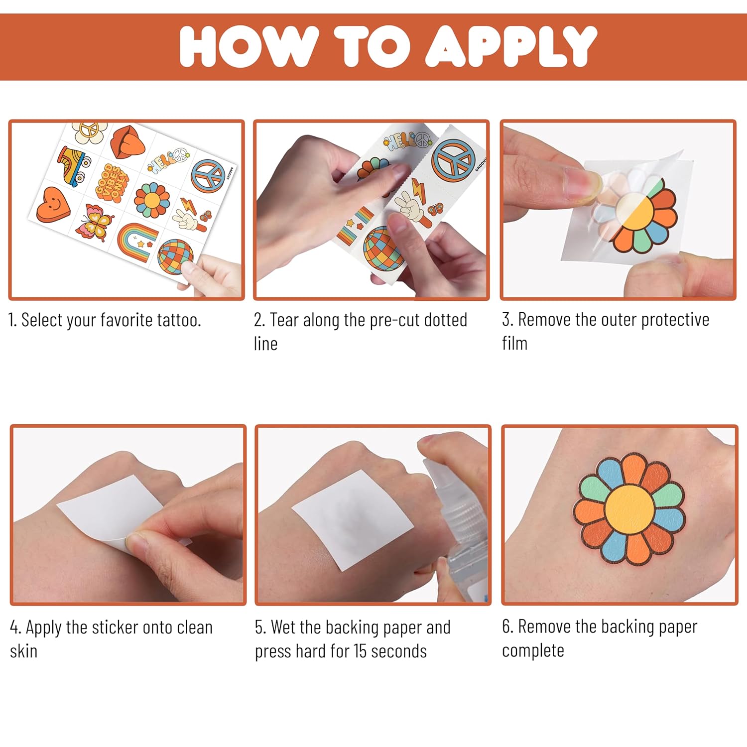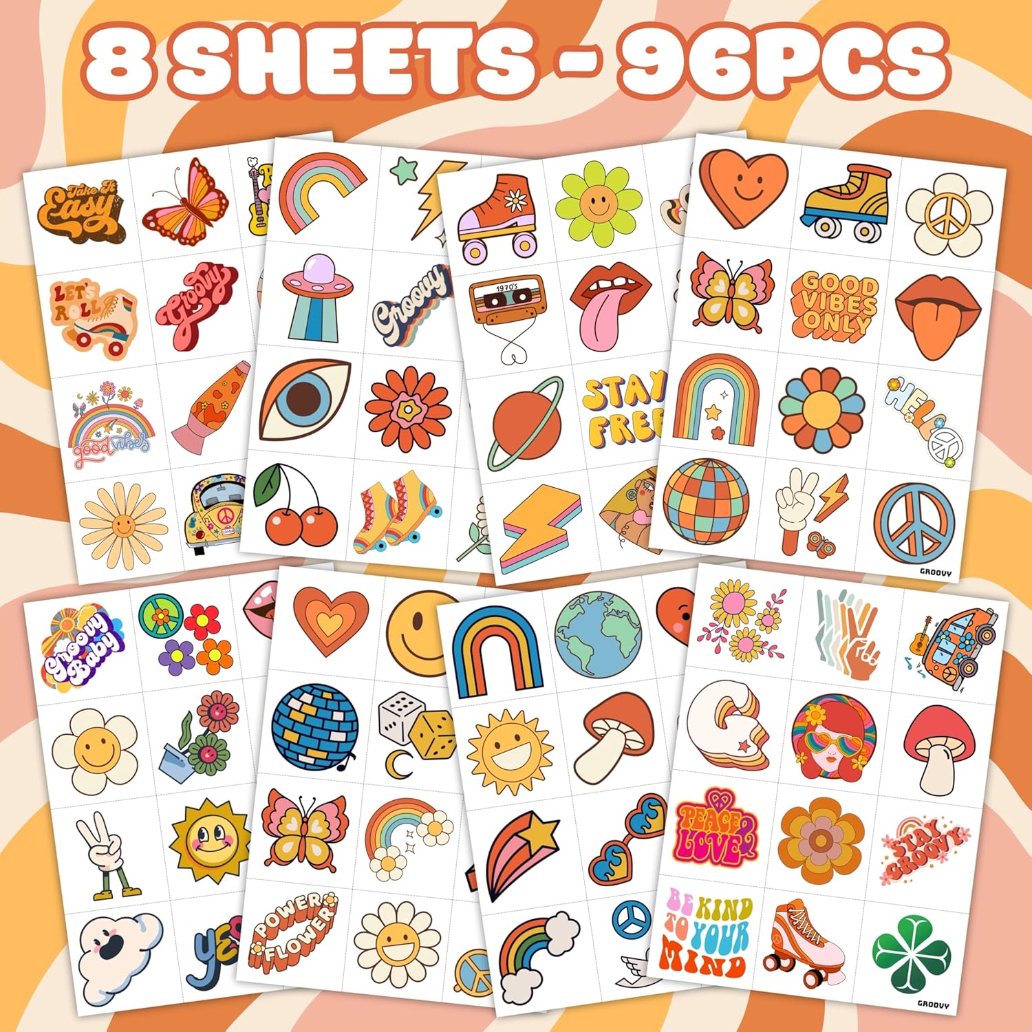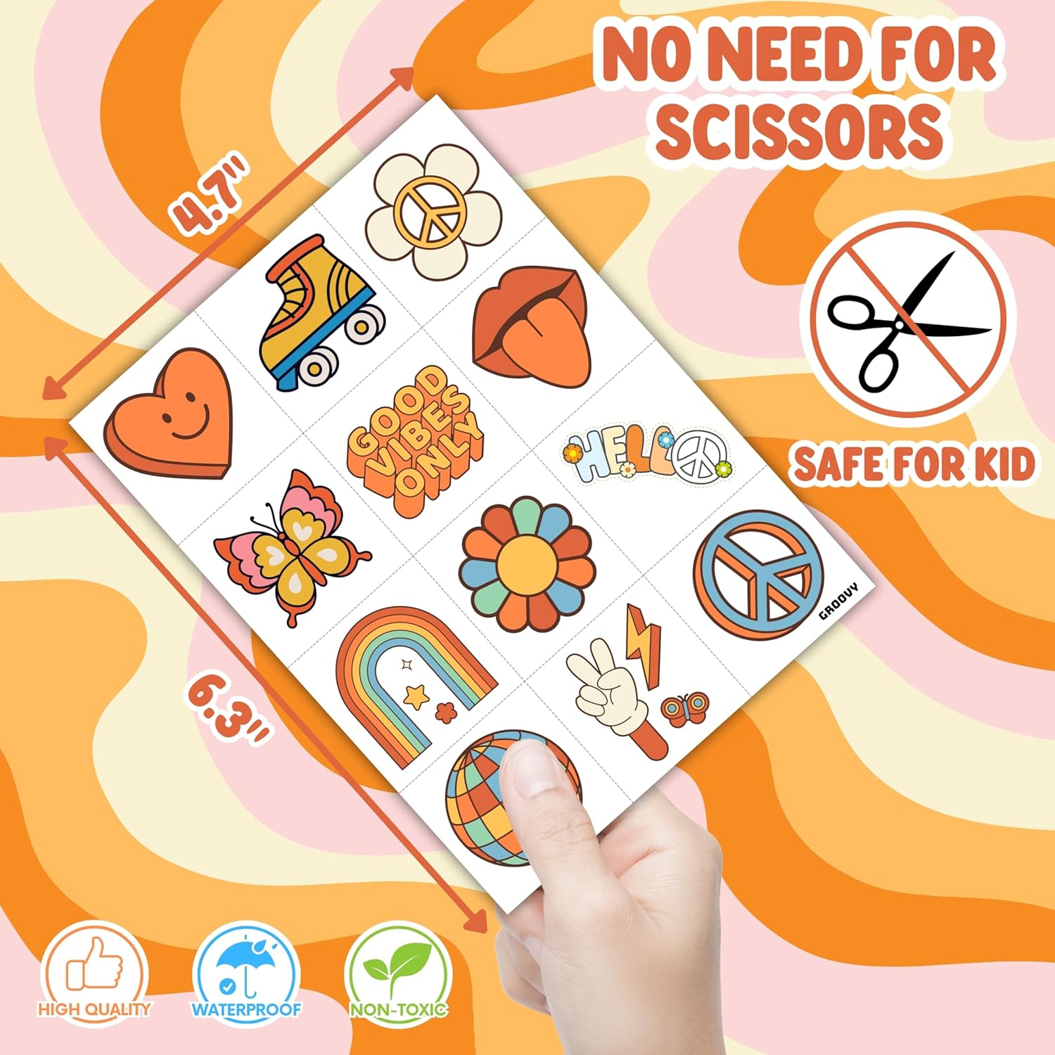 🌼【PERFECT PRE-CUT TATTOOS FOR THEMED GROOVY 70s DECORATIONS】: Groovy 70s pre-cut temporary tattoo stickers include 8 sheets in total, featuring 96 super cute and vibrant designs. These fun tattoos are perfect for party favors, holiday-themed small gifts, and decorations. Each sheet measures 16 x 12 cm (6.3 x 4.7 inches)—ideal for kids! Thanks to the pre-cut perforated lines, you can easily tear them apart by hand—no scissors needed!