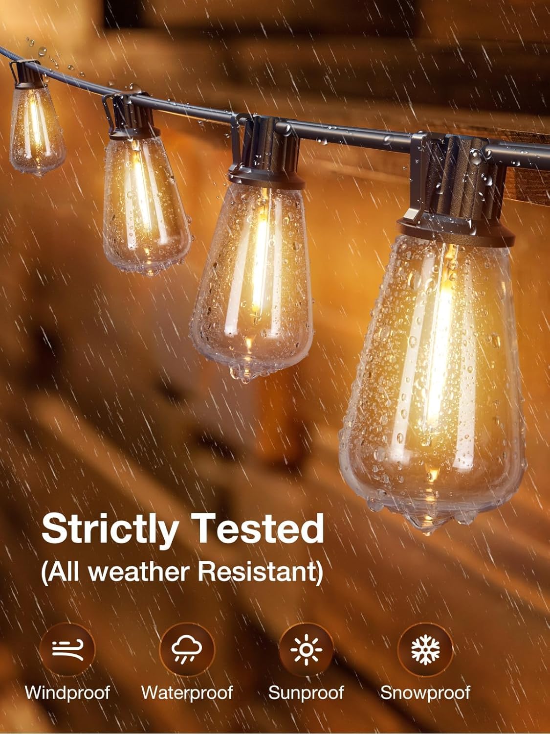 【Weatherproof and Shatterproof】IP65 Waterproof led string lights can withstand cloudy, damp, windy, foggy, rainy, snowy, or extreme temperatures,This making it ideal for year-round use in outdoor spaces like patios, gardens, and bistros, creating a festive and inviting atmosphere.Besides, these led bulbs made from unbreakable PET material and hard anti-drop plastic shells,This ensures the safety of your family, as there is no risk of broken glass shards while hanging these backyard lights