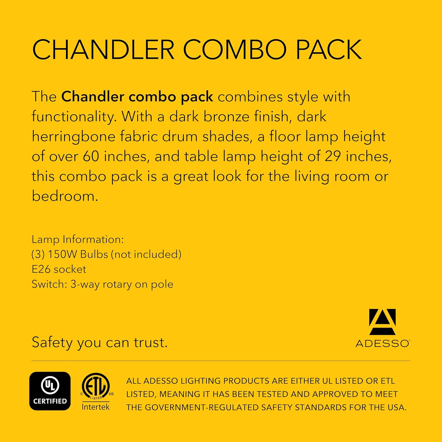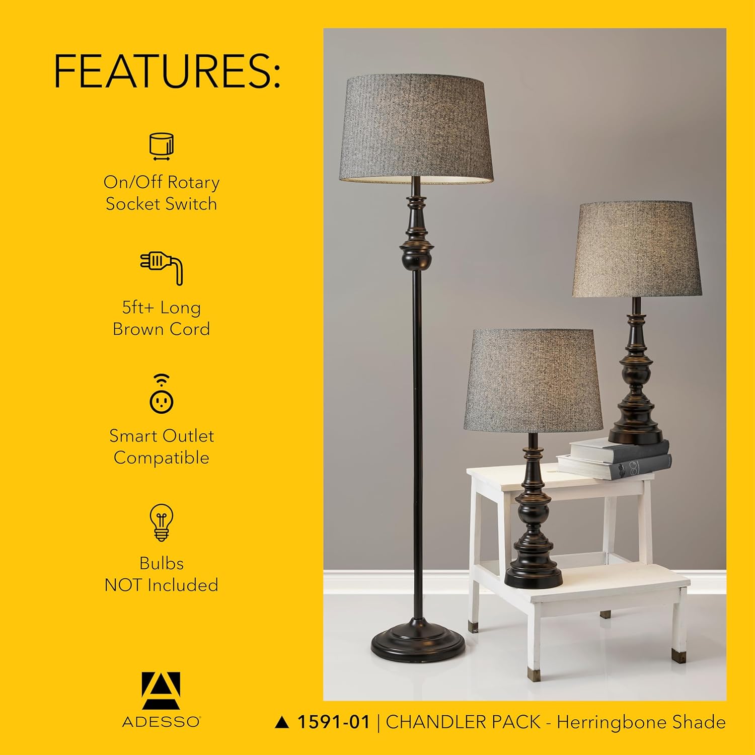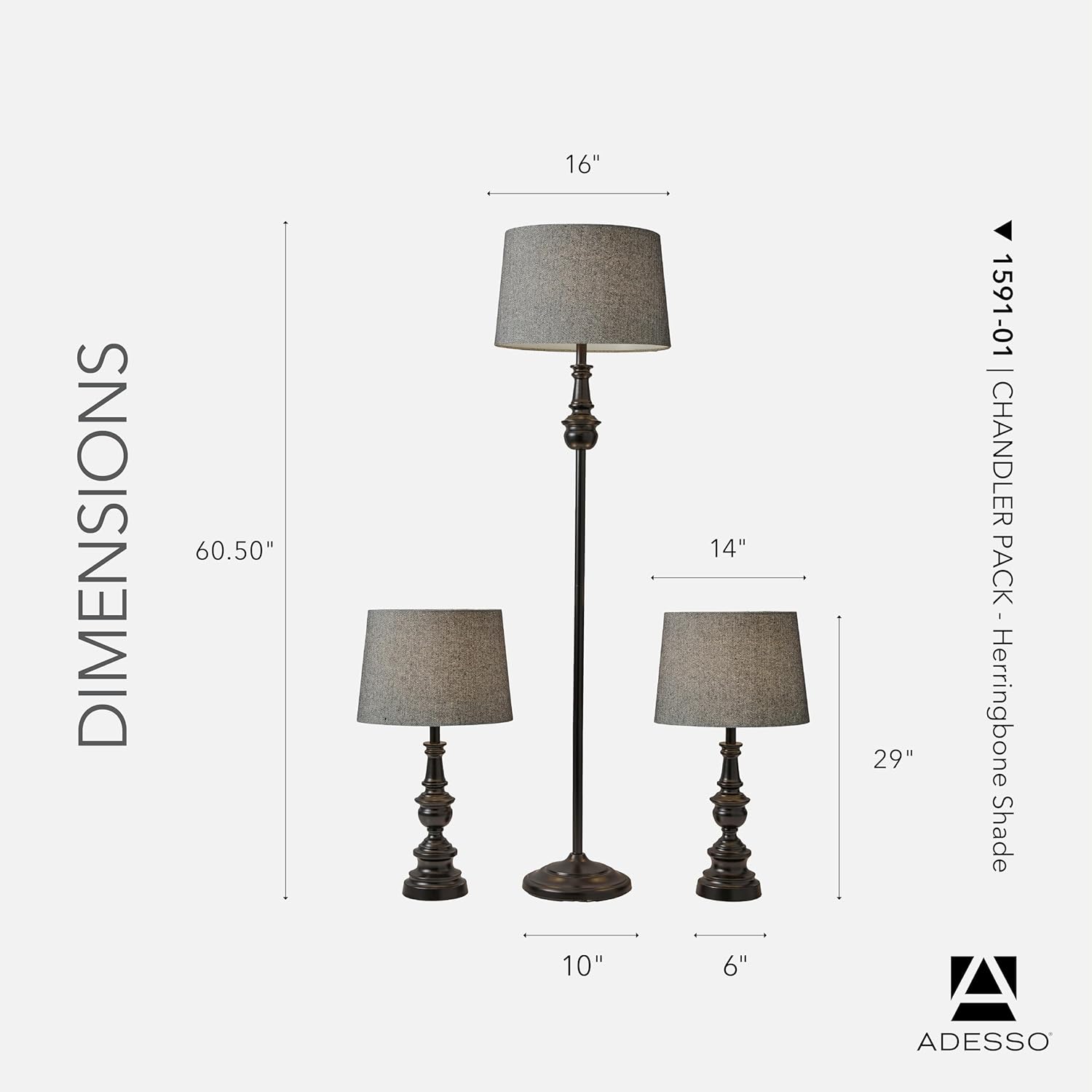 Upgrade your home’s lighting with the Adesso 3-Piece Lamp Set, designed to bring both functionality and style to any room decor. With Adesso’s commitment to innovative design and affordability, this lamp set offers high-end aesthetics without the high price. Enhance your bedroom decor and living room decor today. This set includes two small table lamps perfect for you desk, bedside, or end table, and one floor lamp, each featuring a rich dark bronze finish that complements various décor styles, from classic to contemporary. The herringbone hardback taper drum shades add texture and elegance, while providing soft, ambient lighting. Designed for convenience, each lamp is equipped with a 3-way rotary switch, allowing you to adjust brightness levels to your preference. Whether you need bright light for reading or a soft glow for ambiance, this set delivers. Each lamp is compatible with 150W incandescent bulbs or LED/CFL 3-way equivalents, ensuring energy efficiency without compromising on brightness.