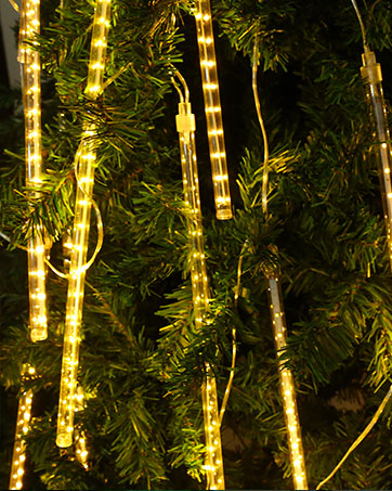 Length Detail: This outdoor lights have 10ft power cord and 14.7ft total decoration length. Wire between tubes is 19.7″, which is longer than others’ rain lights so you can wrap them around trees more easily. There are 10 tubes and each has 36 LED beads