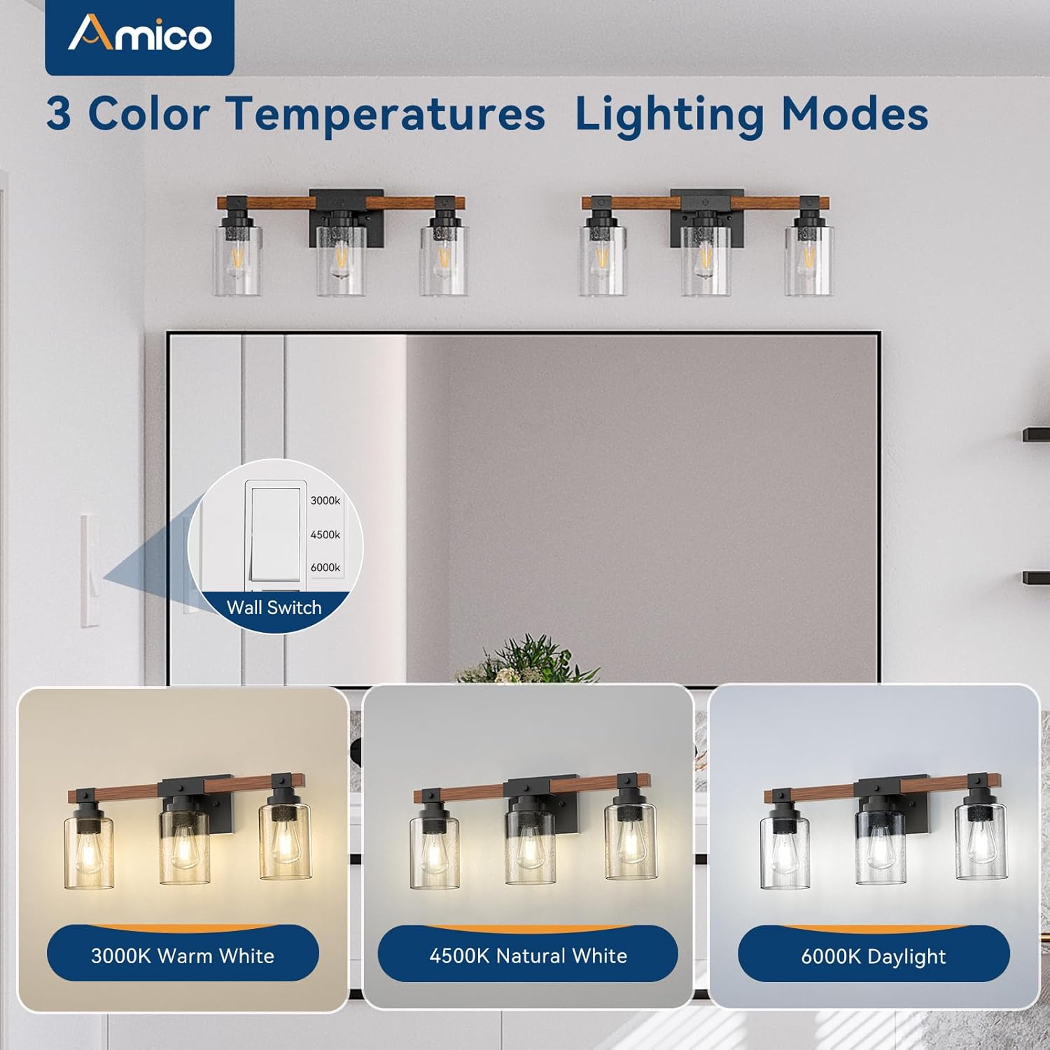 Industrial & Farmhouse Style Design: Amico 3-light vanity lights feature an antique wood finish and bubble glass shades, perfect for rustic and farmhouse decor. These bathroom light fixtures add a touch of simple elegance to any home, making them an ideal choice for your lighting needs.