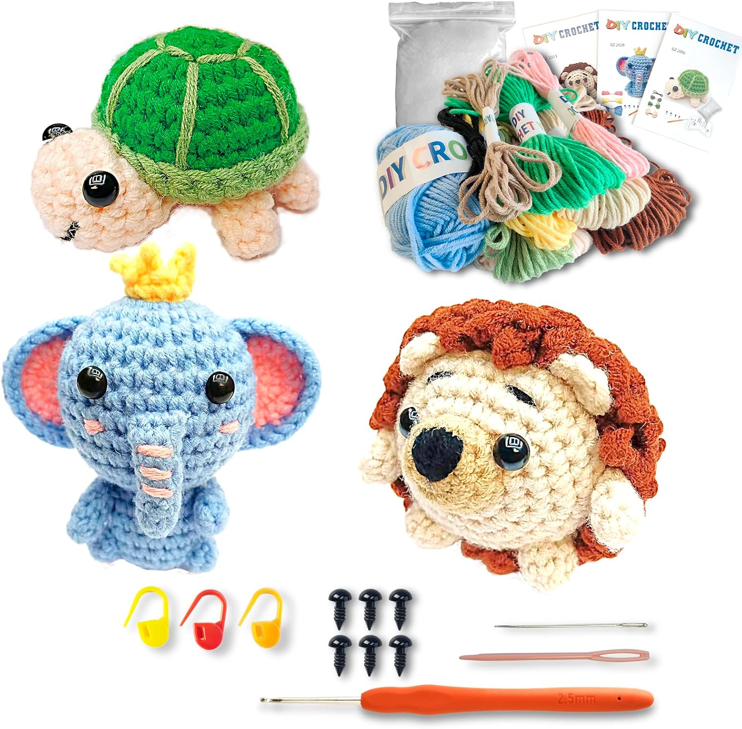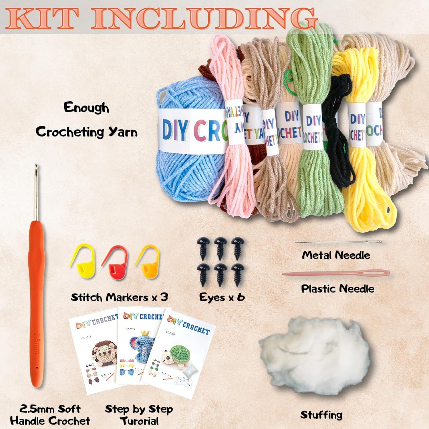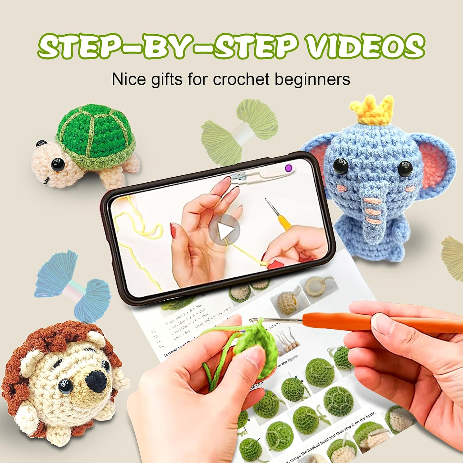【 Crochet kit for beginners 】 Crochet kit with text picture instructions and video instruction, beginners can easily follow the steps to crochet and create three cute animals including a Hedgehog, Elephant and Turtle. Popular with crocheters and knitters who want to learn to crochet.