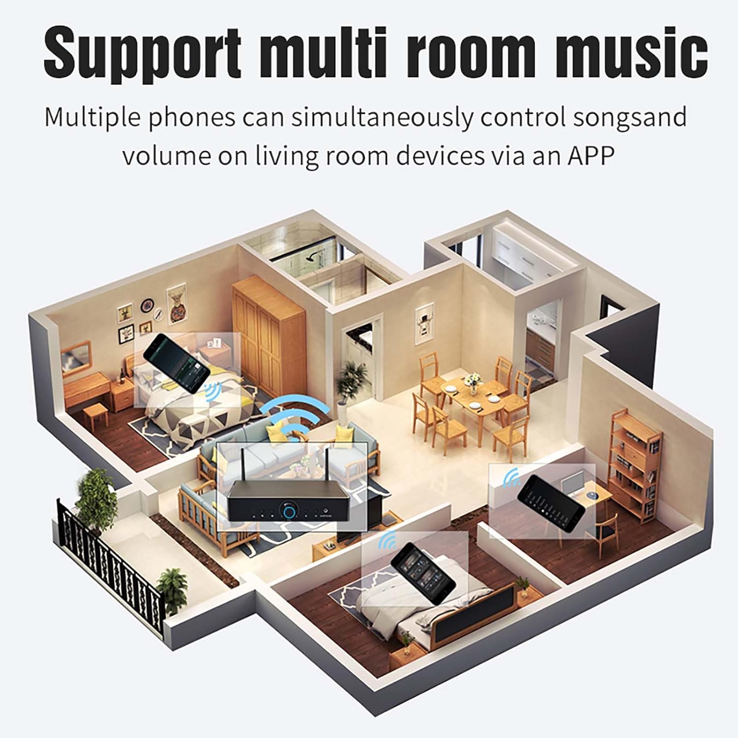 Multi-Room & Multi-Listener Synchronization – Create a seamless whole-home audio system. With support for multi-room sync (Party Mode), play the same song across different zones or different music in each room—all controlled from one smartphone. Multiple users can also connect via WiFi simultaneously.