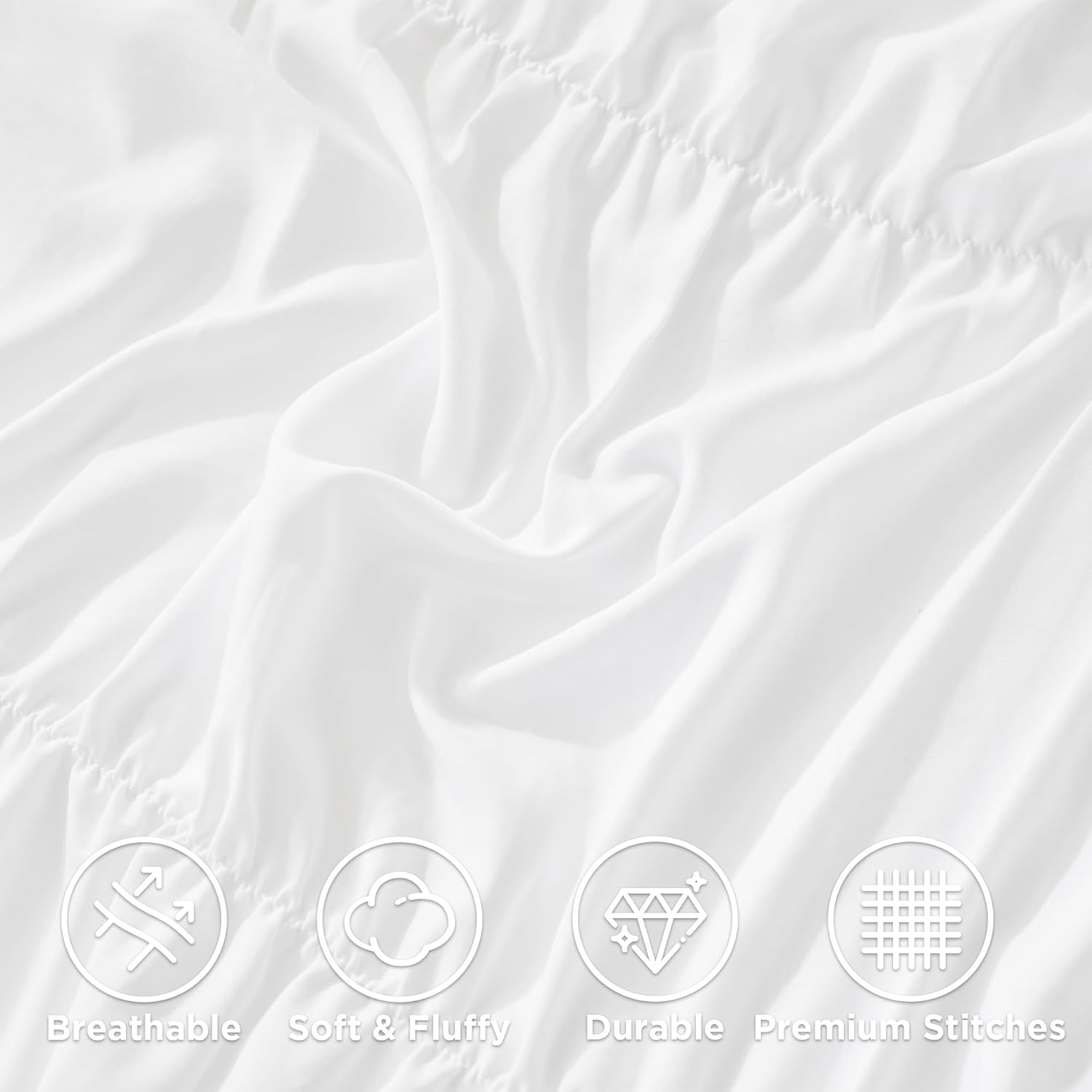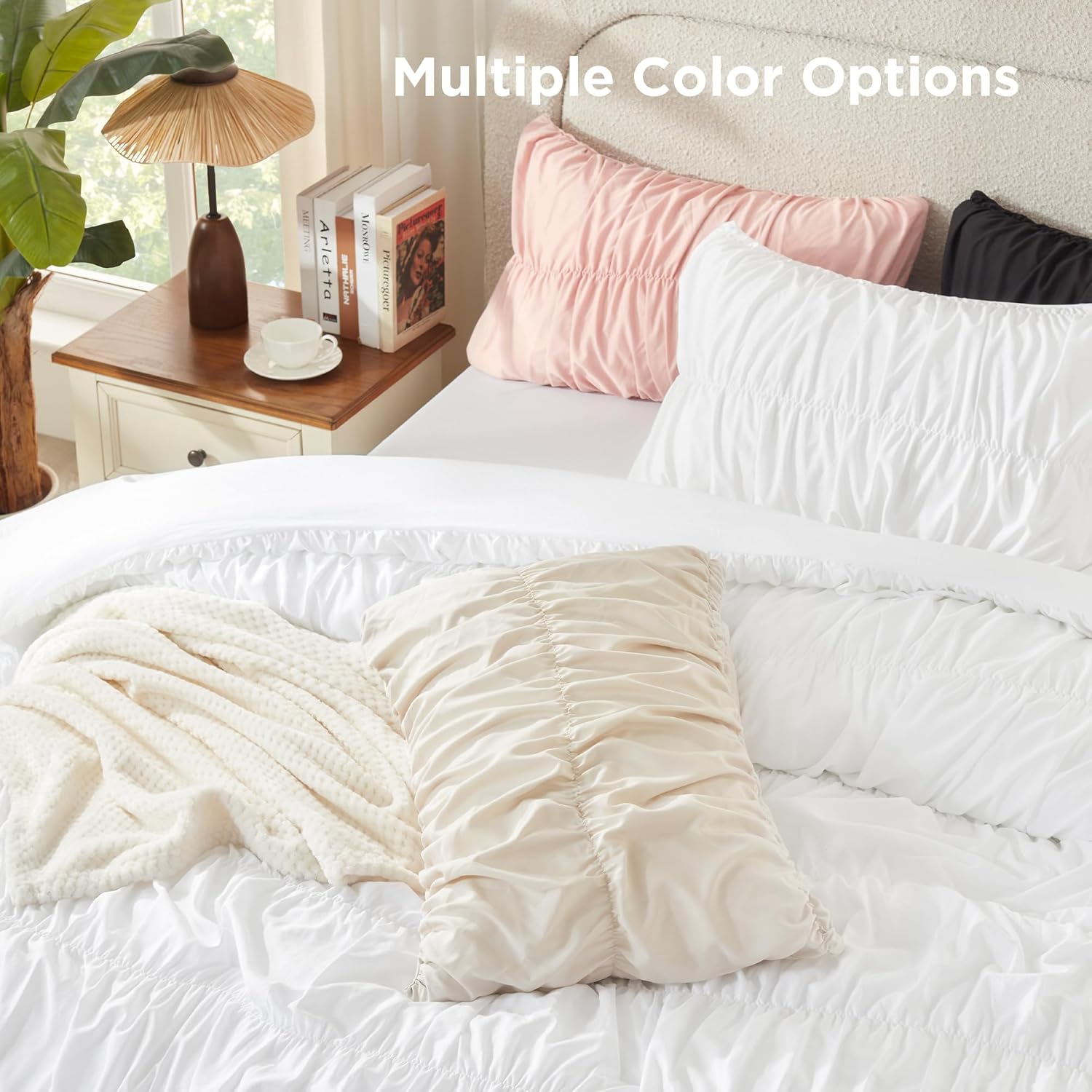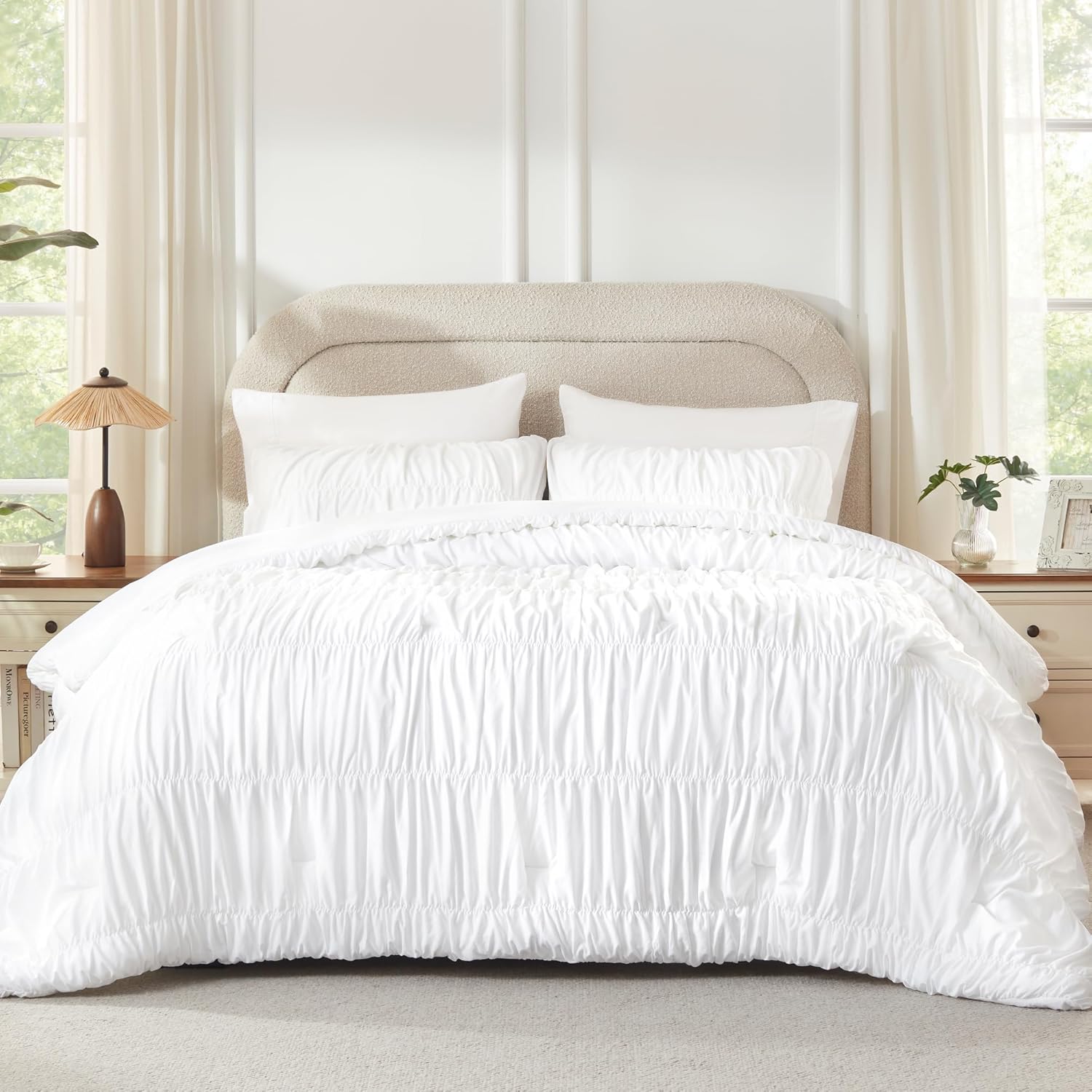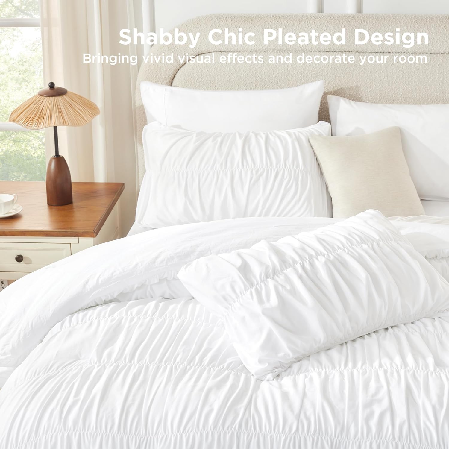 Andency Ruched White Queen Comforter Set, Shabby Chic Pleated Bedding Sets 3 Pieces, Lightweight Soft Boho Ruffle Bed Set for Girls, Kids, Women, All Season