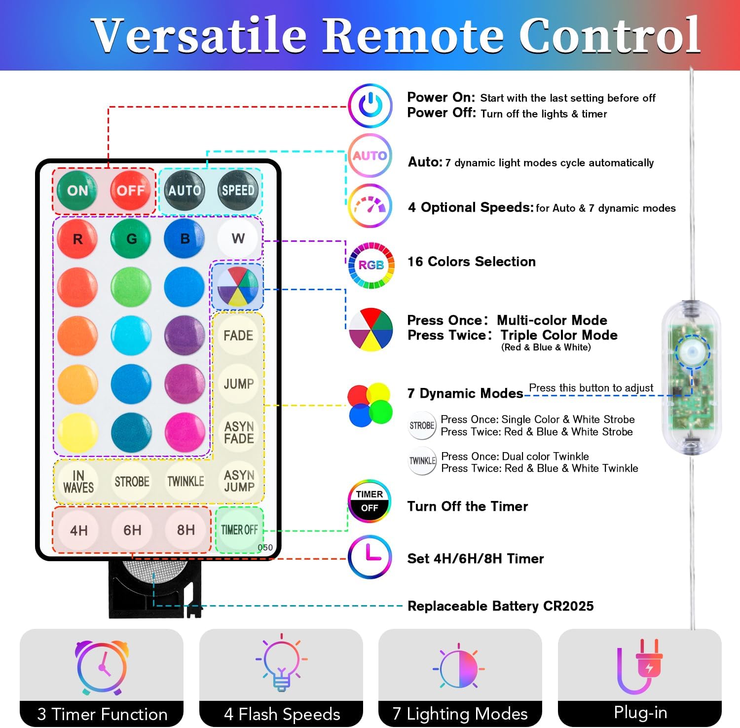 VERSATILE LIGHTING MODES:With 7 lighting modes to choose from, you can easily set the perfect ambiance for any occasion. The available modes include Fade, Jump, ASYN Fade, ASYN Jump, In Waves, Strobe, and Twinkle. With upgraded color options available, you can brighten up your Christmas decorations with multicolored modes. If you’re decorating for July 4th, simply press the multicolor button twice to switch to the red, white, and blue lighting modes.